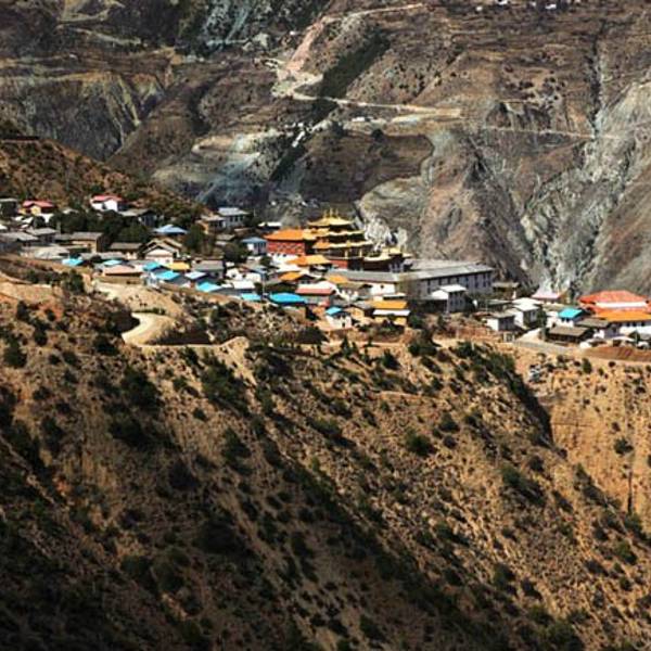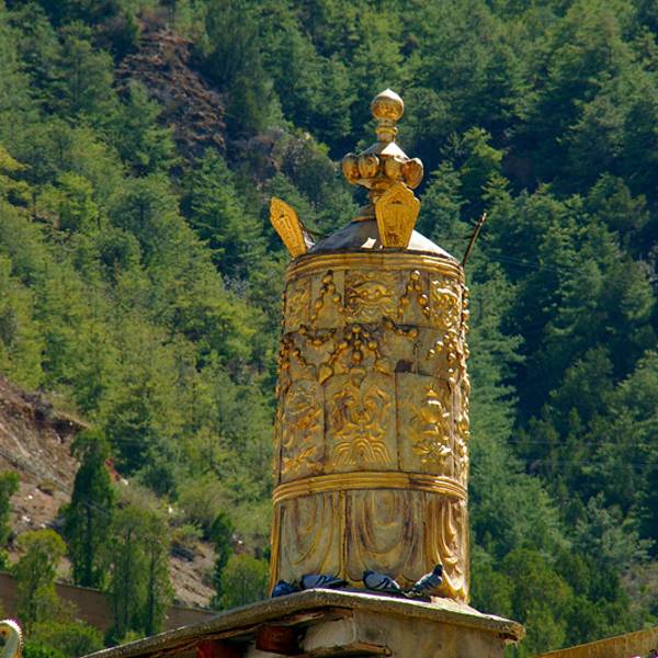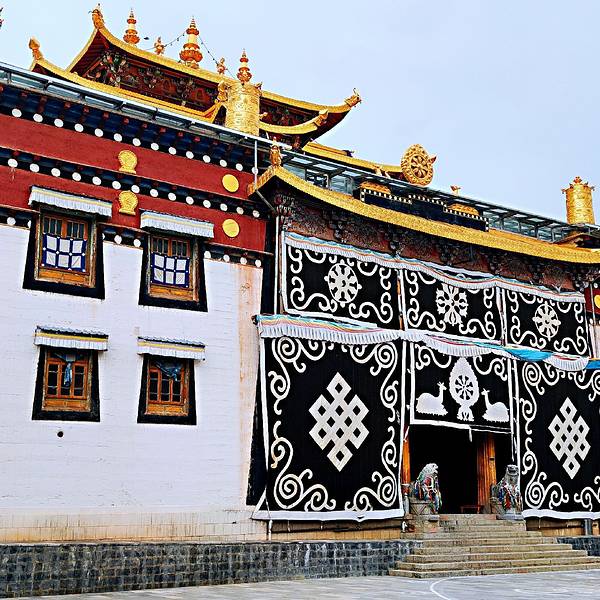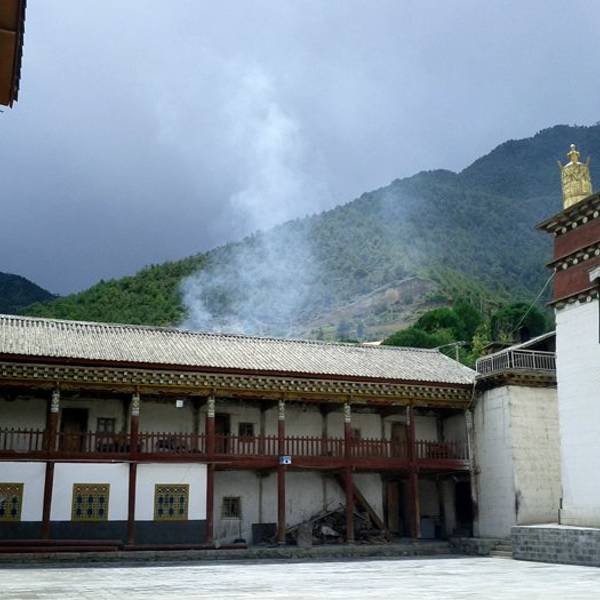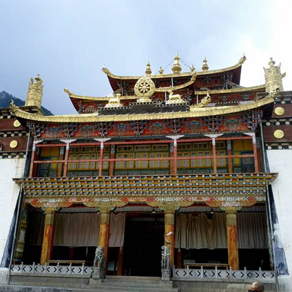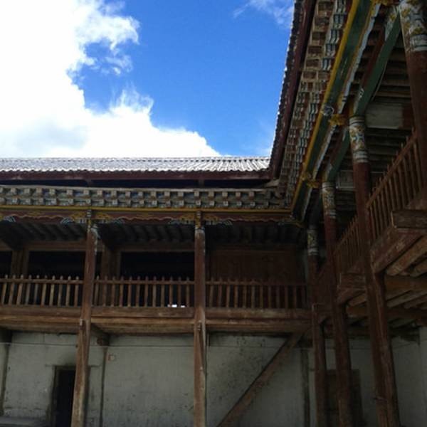 东竹林寺位于德钦县书松乡境内,214国道路边,始建于1667年,原名“措措冲岗寺”,意为仙鹤湖畔之寺,建成时位列康藏十三林之一。东竹林寺藏品丰富,珍贵文物众多。珍贵的是三座立体坛城。分别是密集金刚、喜乐金刚和大威德金刚的道场。坛城上镶嵌有天珠、玛瑙、红绿松石等珍宝。更有一具活佛的肉身,据称是文革时期被当地藏民藏于山洞中才免于被毁。除此之外,各色唐卡、刺绣、经书、佛像、度母像等,都是平时难得一见的珍品。东竹林寺主要由正中的大经堂和周围环绕的一圈僧舍构成。大经堂为四层,由82根大柱支撑,底层是僧侣们平时打坐诵经的地方,供有格鲁派祖师宗喀巴大师及弟子达玛仁青和一世班禅克珠杰画像(俗称“师徒三尊”),两侧是释迦牟尼、观世音、文殊、度母、普贤等菩萨塑像。第二、三层分别为经堂和佛殿,以及堪布(掌教)念经和起居的静室。东竹林寺镇寺之宝“立体坛城”就位于三层的经堂内。各层都装潢富丽,加上雕塑、唐卡、壁画的装点,显得金碧辉煌,气氛庄严肃穆。每年藏历八月二十七到二十九日三天,寺庙里都会举办僧值节,节日当天会展示一副宽5.2米、高8.5米的巨幅五彩绸缎堆绣阎罗王唐卡,平日难得一见,颇为珍贵,此外还有盛大的藏戏表演和跳神仪式,是康区僧俗民众祈福迎祥的欢乐节日。
