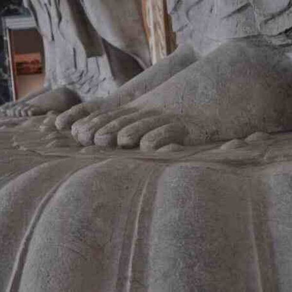 佛像坐北面南,全高6.75米,底座高1.5米,底面积7.29平方米,为单身立式圆雕青石造像。佛像高肉髻,面方圆,微笑,丰颐大耳,法相庄严,身披“褒衣博带式”通肩袈裟,内着僧支祗,胸前打结,“施无畏与愿印”,赤足立于莲花座上。佛像雕刻精致,造型生动,人体比例准确,衣纹舒展流畅,堪称艺术珍品。