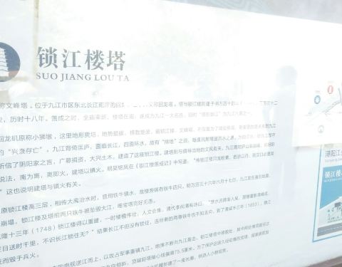 实用 总的来说,还是对得起20元的门票价格的。我们是参观完浔阳楼后,直接步行前往的。所以交通还是十分便利的是我们随团旅游的最后一站,位于九江市内。距离浔阳楼不过500米,名气没有浔阳楼大,也是一座新仿建的鼓楼。我们是参观完浔阳楼后,直接步行前往的。如果在市内,可以乘坐5路或23路公交车,到锁江楼站下车即可抵...是我们随团旅游的最后一站,位于九江市内。距离浔阳楼不过500米,名气没有浔阳楼大,也是一座新仿建的鼓楼。我们是参观完浔阳楼后,直接步行前往的。如果在市内,可以乘坐5路或23路公交车,到锁江楼站下车即可抵达。所以交通还是十分便利的。楼有三层,楼旁有四头镇水铁牛,登上去可以看看江景,吹吹凉风,还是非常惬意的,浔阳楼后有一古塔,名文峰塔,也是后来修复的,管理员说内有木梯,可以上去,但我们去的时候,并没有开放,古塔周围还有许愿树若干棵。据说可以将许愿牌抛上去,抛得越高,愿望实现的希望就越大。总的来说,还是对得起20元的门票价格的。不过,真心建议大家不要夏天去,因为楼里面非常热,感觉有点像蒸笼包。 展开