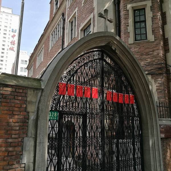 红色哥特式建筑十分显眼,是上海著名基督教堂。