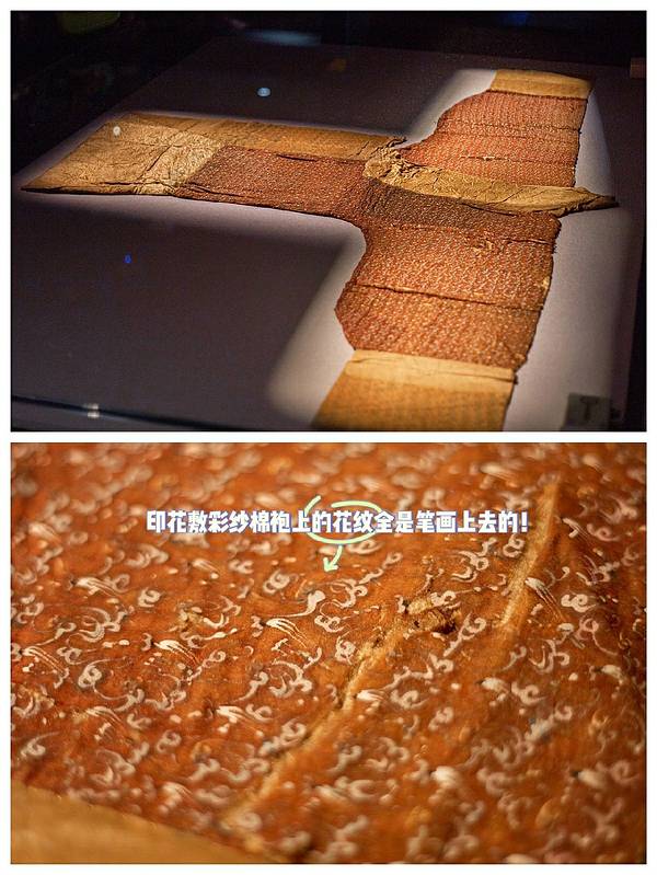 ✔️印花敷彩纱丝绵袍:首次发现的“画衣”实物,布料上的花纹竟是一笔笔彩绘上去的!工艺复杂,价值连城!