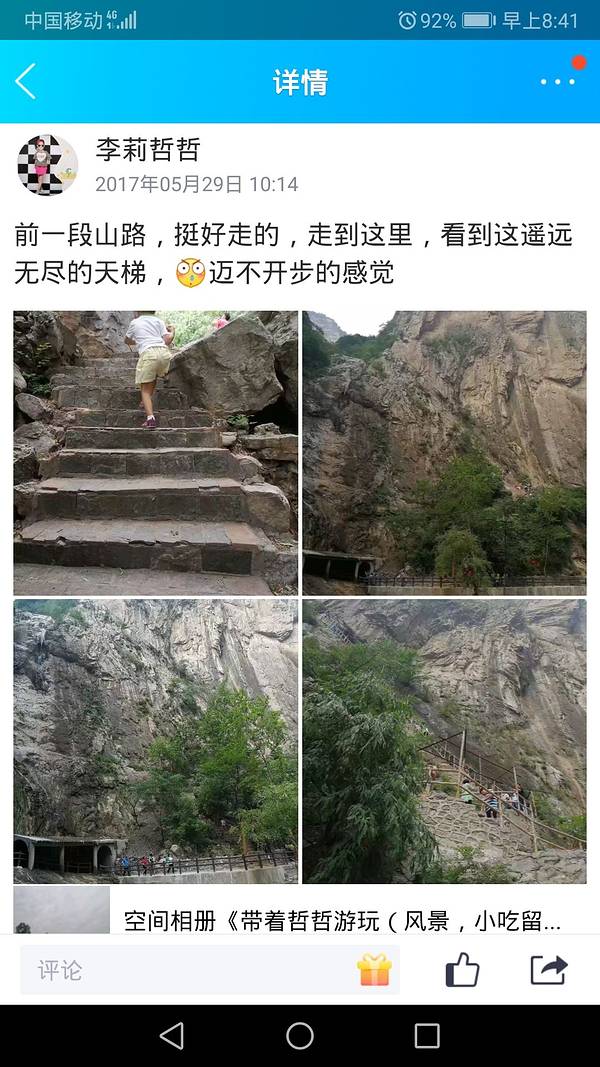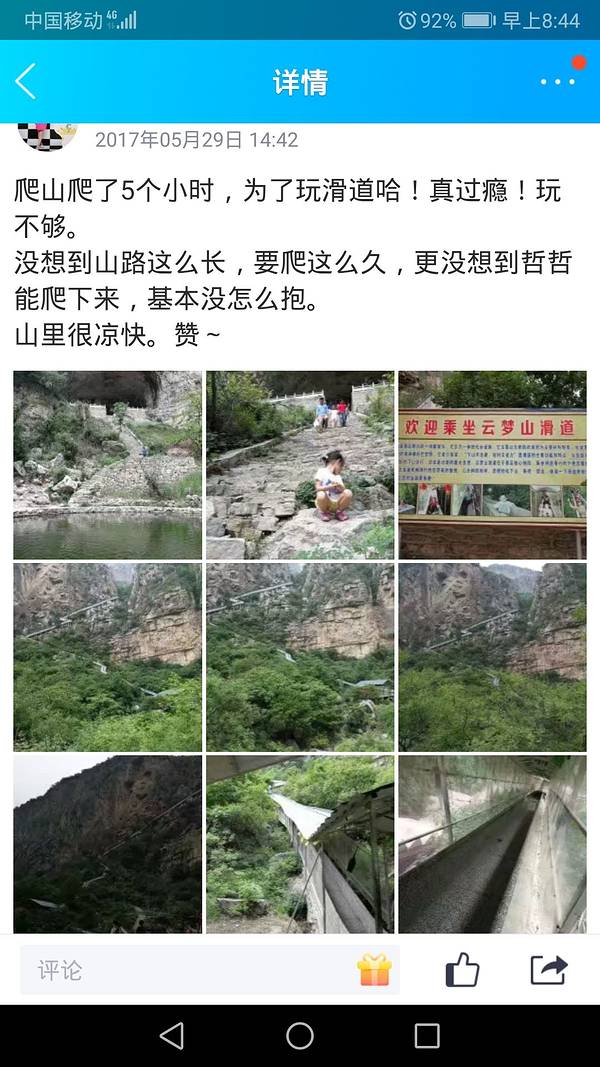 风景很不错,但设施很简陋,感觉不符合4A级景区标准。总之安全隐患很多。很多地方我要背着孩子过本次去云梦山感觉很惊险,两个妈妈加五岁宝宝,幸好妈妈们的体力ok,不需要我照顾。风景很不错,但设施很简陋,感觉不符合4A级景区标准。首先路旁没有围栏,很多地方路边就是水沟或山沟,很危险。其次,就是水漫...本次去云梦山感觉很惊险,两个妈妈加五岁宝宝,幸好妈妈们的体力ok,不需要我照顾。风景很不错,但设施很简陋,感觉不符合4A级景区标准。首先路旁没有围栏,很多地方路边就是水沟或山沟,很危险。其次,就是水漫过地面路的地方,很随意地用砖垫,而且是很窄的那种,这是考验平衡能力吗。山间水多的地方也是放一块石头就算了。一点都不稳。很多地方我要背着孩子过。最后,就是我发的这个图,返程的途中是泥地,有的地方很窄,有的地方很陡,会滑。很惊险的一次旅程,现在想想就后怕,一定不要带行动不便的老人和小孩去。另外景区的有围栏的地方也检修一下吧,感觉都快锈透了。还有有的地方突然就没围栏了,不注意地会抓空,掉下去。总之安全隐患很多。 展开 2019-11-10 16:01