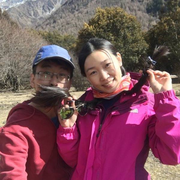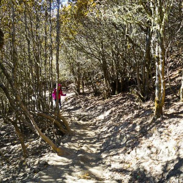 由于没有带水,口渴难耐,山脉大哥果断支援了几口热开水,救命之恩,没齿难忘。等了一会,琳达来了。她后面还跟着三个走错路的街坊。走错路了,还体力这么好,赶上并超过我们~林熹等街坊也估计累了,在一个地方休息。作为摄影高手的林熹,给我来了一张,这张是我今天徒步过程唯一正面过程照了。别人镜头下的琳达和我……趁着休息的时候,和他们小聊了一下。智猪说他们几个经常爬山,体力还行。今天估计多走了5公里,都差点走到大本营了。刚才走回正路,是走野路,还差点滑下来,吃苦不少。