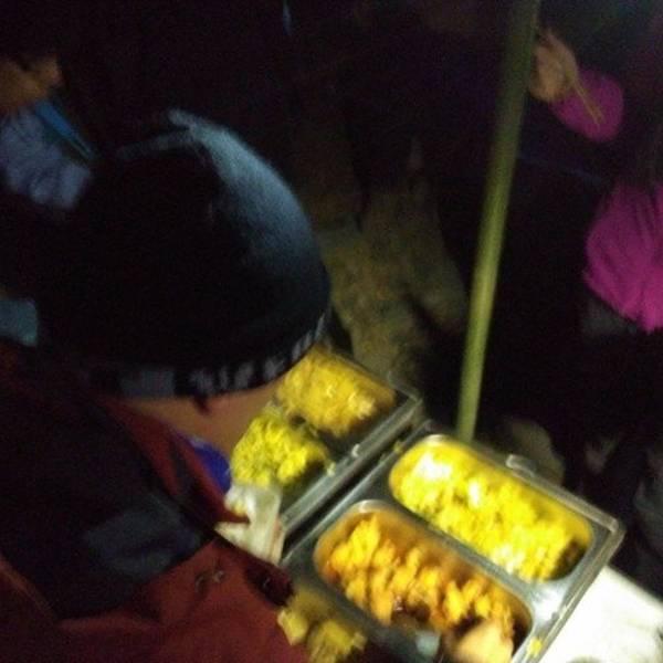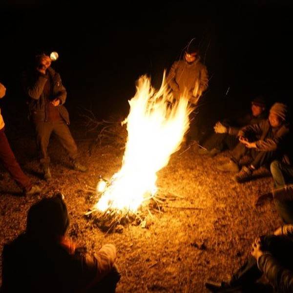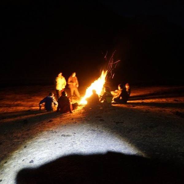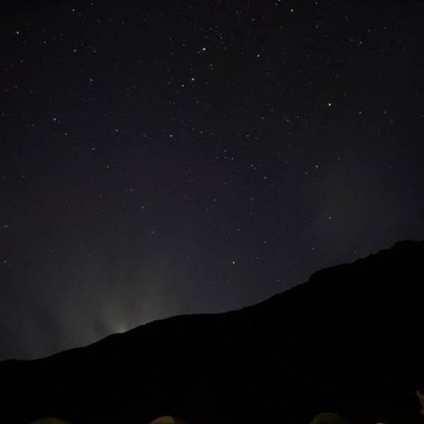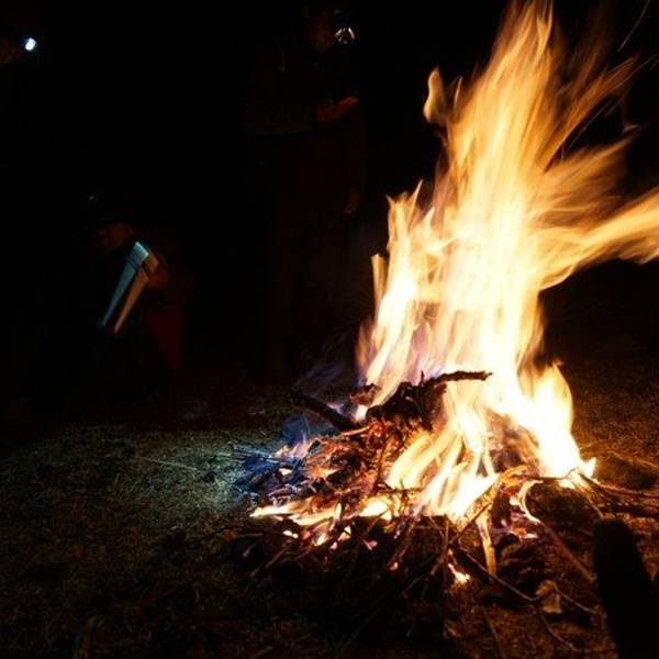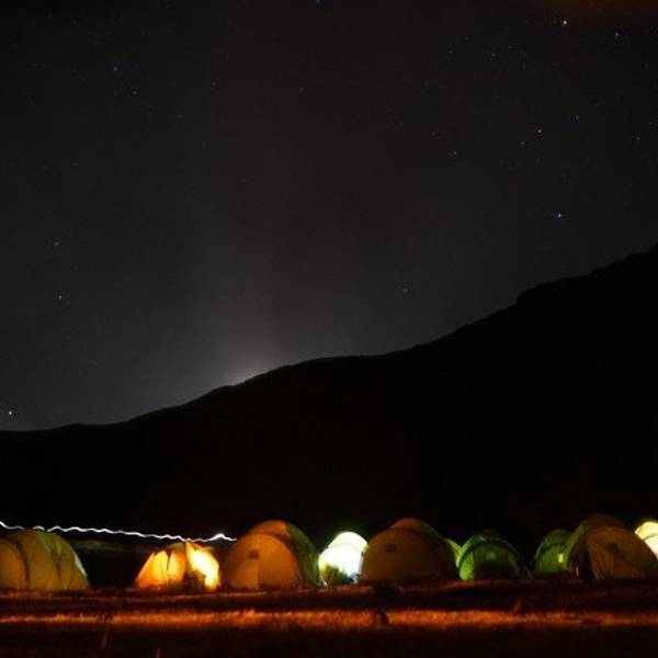 吃饭的地点是在协作搭建起来的一个大的帐篷里。吃的东西不错,有鸡蛋,还有几个炒肉。在山里算是条件非常好的。热腾腾的米饭,吃了感觉充满能量。蜗牛发烧了,但是也起来尽量吃了一点,实在是吃不下去,又回去睡觉了。老鬼默默的帮他去河边洗了碗筷。琳达估计也累坏了,吃了一点就回帐篷睡觉去了,第二天早上才看到她。吃晚饭,天也完全黑了。我拿相机,想拍一下大家的帐篷,找不到可以固定的地方,于是只能手持曝光1s,好在相机的拥有五轴防抖功能,效果还可以接受。大家按照彦伟的安排,在附近找了很多干树枝。树枝加牛粪,并在花海子边点起了篝火。