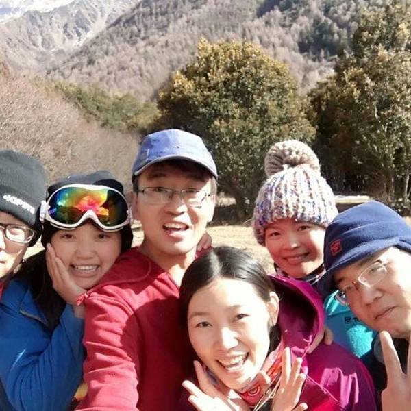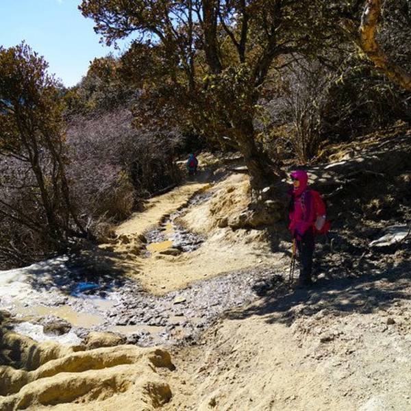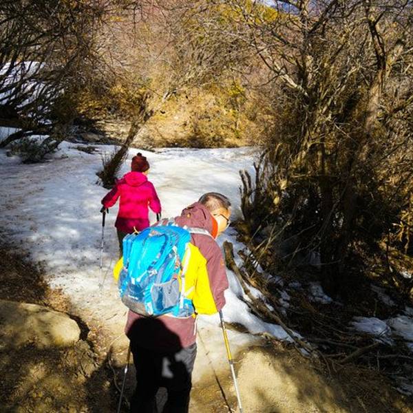 原来计划我们必须在1点钟就到这里,现在看看时间,已经是2点10分了。我们的速度已经远远慢于计划。由于我们吃饱了,所以也就选择不停留,继续赶路了。这里是一个关键的分叉口。照片的左边上坡是直接去大本营,而右边的路是去花海子。我们找了几个不同的人确认,最终定了方向。而在我们到达这里之前,有几个街坊,已经不知不觉的往大本营方向走去…这个我们后面再提。在我们问路的时候,山脉大哥也赶了上来。离开休息站不一会,琳达已经明显感觉走不动了,前进速度非常慢。山脉大哥看在眼里,觉得按照这个速度,要在天黑时到达营地是不可能的。于是他带头,琳达在中间,还能走动的我走在最后。就这么一个三人组合,整体前进速度快了很多。山脉大哥说,他平时爬山速度比这个快很多,现在是高原,他都不敢走那么快。林间小路偶尔会看到小溪,这个时候,发现了冰挂,体积秒杀了天堂顶看到的一切。山脉大哥在前,琳达中间,我在后面拍照,以雪山为目标,冲啊!背景不错,给大哥来一张。大哥很开心的说,有摄影师真好!回望来时的路,跟着大哥,我们已经走得很快了。而阿力有点脚抽筋,还有米粒都交给了彦伟去照顾。这个情况下,我们能做的就是照顾好自己,尽力不要再去麻烦别人了。行进速度差不多人的走在一起比较合适。不然大家都不能到达营地。此时是下午2点50分。又是一段长长的林间小路,就当我和琳达都快要走不动的时候,发现前面空阔的平地传来了熟悉的嬉笑声。山脉大哥往前一探,告诉我们,前面有我们的队员。还是我们熟悉的蜗牛等人。