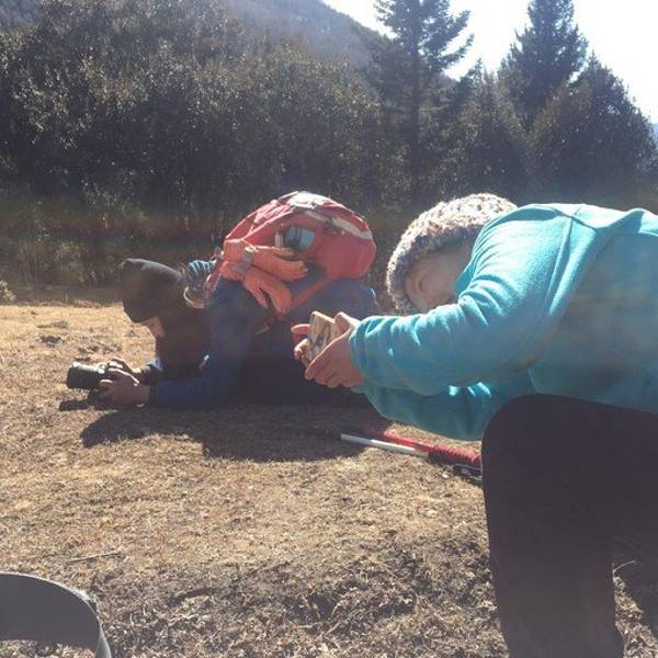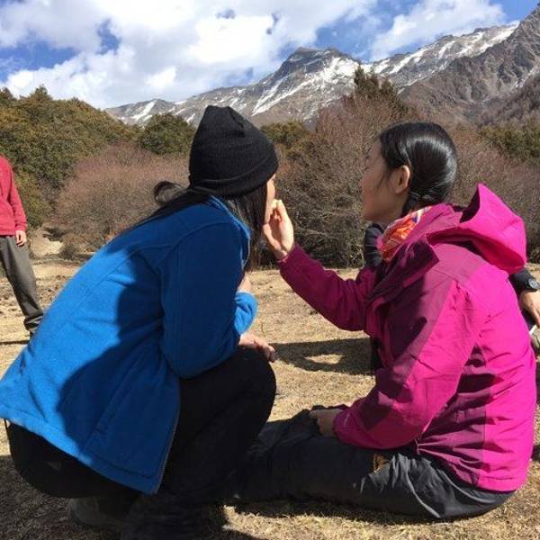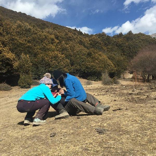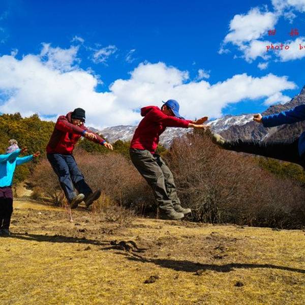 我们咬牙来到平地,看到了蜗牛、大圣、老鬼、诺亚、AV哥等人。终于赶上你们了……55555。大圣看到我们,很惊讶,据说他们一直一边走一边等我们,始终不见我们的踪影。这两个女生在拍什么呢?原来是在拍地上的牛粪,蹦蹦跳跳的蜗牛原来只是背景!这张主角由牛粪变成老鬼。我的头痛已经到了比较严重的地方,和琳达不约而同的瘫坐在地上。蜗牛可能对昨晚把琳达玩坏的事情有所内疚,马上上来嘘寒问暖。琳达则像温顺的小猫,向蜗牛倾诉一路的苦与累,虐死我了…然后,还合照了一张,对我造成一万点魔法伤害,还不能恢复的。细看之下才发现,这里景色不错,难怪大家都在这里拍照片。一想到可以拍照,琳达马上神奇般的站起来了,小宇宙爆发,我要拍照!然后,她开始和在云南泸沽湖一样,做着瑜伽动作,标准与否就见仁见智吧。蜗牛自从说了那句“老袁来了,我可以不用拍摄了”之后,就尽情的投入各种动作的拍摄中,你们考虑下我已经快要挂掉的感受没?