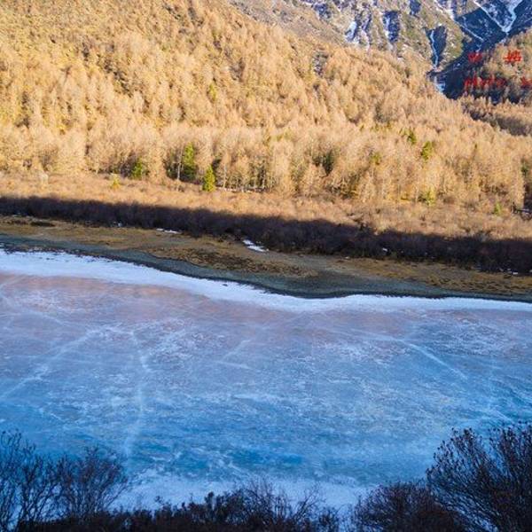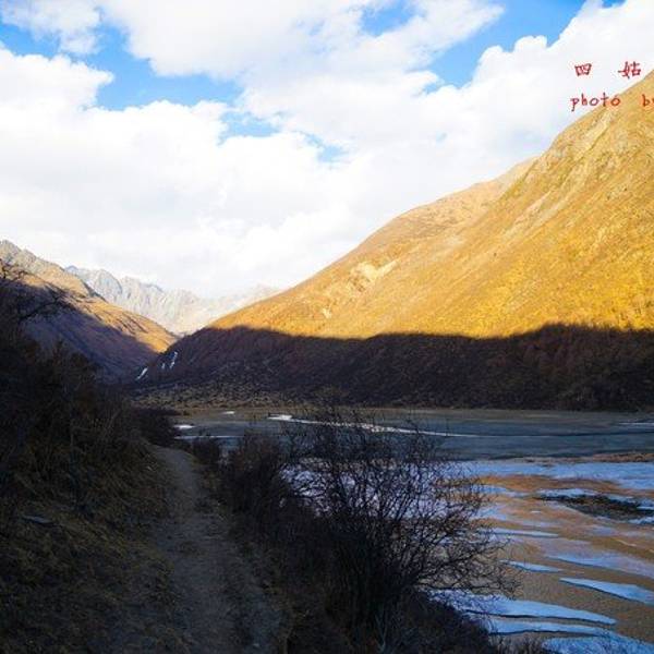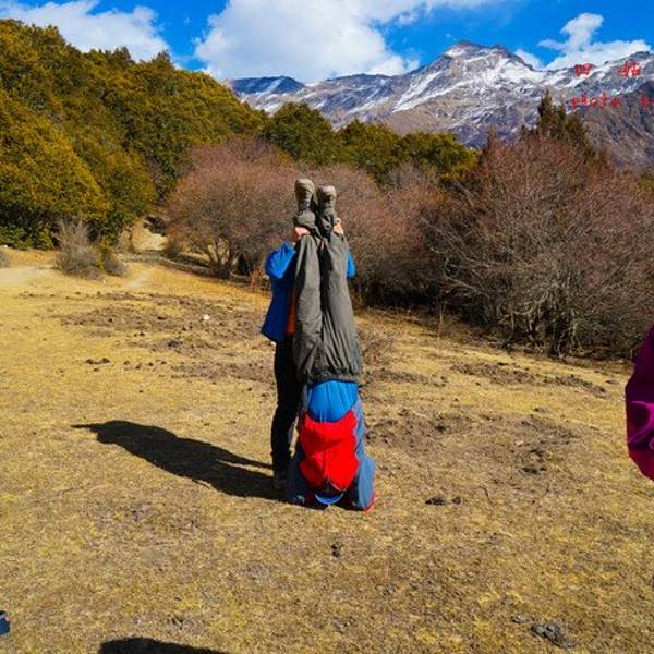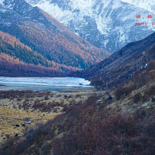大圣的两个绝招,分别把蜗牛和老鬼打飞,而诺亚确稳如泰山,与别人形成鲜明对比。看到他们活奔乱跳的,我真是羡慕不已啊。这是高原啊,你们还一点感觉都没有……就在我们玩耍的时候,彦伟带着阿力终于来了。原来阿力实在是不行了,彦伟只能帮阿力背了包。有了彦伟带来的相机,琳达终于给我拍了一张了!大师出手,感觉就是不一样!刚才还玩得好好地,怎么突然又打起来了?小伙伴的合照,唯独缺了我,因为我已经头痛到不想动了。一路的景色不一样了,开始出现了雪山。满山的树木如果来对季节,将会是非常漂亮。琳达的体力越来不不行了,经常走着走着就停下来不走了。然后不停的问还有多久能到?其实,大家都是第一次来,谁知道还要走多久,一直走下去就对了。我看琳达休息太久,就推着她走。她就无意识的继续往前走。一路反反复复。山景非常漂亮,山脚下开始出现海子了。凭借印象,我觉得这里开始就是花海子了。花海子藏语叫西尔仓梅朵措,这里的海拔在3830米左右。早期为冰U谷,后受两侧支沟泥石流堆积形成现在的沼泽化湖泊。春季、夏季花开草茂时,如一盘翠玉撒落花草间,在阳光的照射下,显得五彩缤纷,流光溢彩。相传爱美的三姑娘时常到这里来采花,一天,听说洪水又泛滥了,冲毁了许多村寨。情急之下,三姑娘将采来的花投入洪水之中,洪水被堵住了,救了下游的百姓,而她采的花逐渐沉入湖底,形成了今天的花海子。站在海边,倾听海浪拍岸,像人的心脏跳动的声音,又像是寺院里明快的鼓声。在湖泊周围那些圆润的石头,就是三姑娘胸前悬挂的珊瑚、玛瑙变成的,远远望去,如珍珠散落。据说如果在合适的季节来到这里,景色会非常漂亮,树木、水的颜色非常鲜艳,只能把这个遗憾留在以后来弥补了。拍了几张花海子的照片,开始走进树林里。还追上了山脉和米粒。路上遇到结冰的小溪,第一次走在冰上的感觉很神奇。有些地方还很滑,必须小心通过。我们这个时候,是多么渴望能看到营地的帐篷,我们都以为花海子和大海子就是同一个地方。休息喘气的时候,拍了下这里的植物。一路还不是有小上坡,每次上坡后都要喘息。力哥还是很坚持的跟在我们不远的后面。琳达一直念叨着什么时候能到,可是每走过一个山坡,就又看到一个山坡,无穷无尽的道路,犹如梦魇般挥之不去,这个时候,大家已经到了体力的极限了,也无心去欣赏周遭的自然风光,去感叹天地万物造化之神奇了。这个时候,只有营地的帐篷,才能吸引大家。每一张琳达背影的照片,都是我推着琳达向前走后拍的,可以看出我也推了不少次了。一路都很辛苦,甚至绝望。但是有个好消息,就是走错路的三个年轻人找到了。已经有人带他们走回花海子的路了。大家想到有三个人比自己还惨,顿时有了些许动力。人就是这样,要在逆境去想办法鼓励自己,才能坚持下去。已经接近傍晚了,风开始大起来了。大家也不约而同的想快点回营地,但是双脚再怎么努力,也只能一步一步走。我除了累,腿脚倒没有什么不舒服,可能是平时重装爬山训练还是积累了一定的效果。这种感觉,蜗牛同样也有。彦伟看到我们实在是快要走不动了,电话联系杨协作,让他从营地安排几个协作过来帮我们背东西,这对我们来说,是莫大的鼓励。也不知道又走了多久,我们终于看到前面有类似于海子的地方,要到了吗?我鼓励着琳达,琳达也似乎走得更快了。前面就是大海子了,营地就快到了,我们胜利了!!哈哈,我们战胜了自己,突破了极限,我们终于到了。然而,我们找遍了整个视线能看到的地方,始终没有看到帐篷,回头问了彦伟,据他判断。这里还不是花海子,只是大海子,离花海子估计还要至少半个小时的时间…