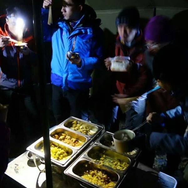 琳达突然来到我面前,张开双手示意来个拥抱。然后,一起经历过一天辛苦徒步,都已经到了极限的我们,就来了一个拥抱。琳达一直说着“谢谢”,户外就是这样,在最艰难的时候,大家只有互相鼓励互相帮助,才能克服困难……也要谢谢琳达的那杯水,不然我估计就…帐篷的位置满地都是干的牛粪,这个时候也顾不得那么多。找到自己的登山包,放到帐篷里。带上头灯,开饭了。