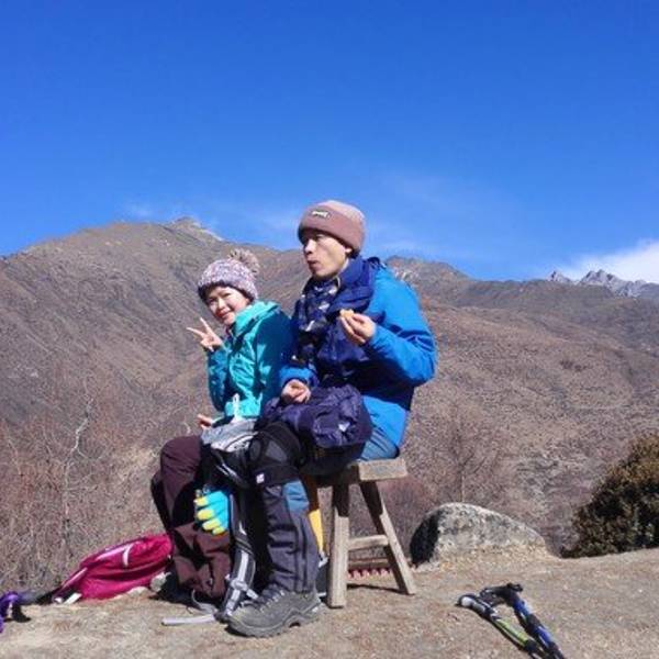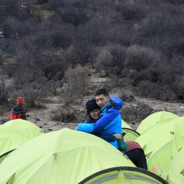 琳达在休息的时候,看我没有带水壶,还倒了一杯热水给我。我一饮而尽!好水!也正是这杯水,让我最后支撑到了营地。琳达,谢谢你的水,你此刻是我见过最温柔最贤惠的妹子了:)由于喝了琳达给我的水,后面的路比较轻松了。夕阳西下,山披上金色的外衣。终于,在下午6点半,经过8个半小时,我们看到了营地。大家都欢呼起来。按照山脉大哥统计,今天一共走了18公里,海拔从3200提升到3800,按照平原高原换算,今天一共走了54公里,爬了1800m的山。这个强度,是我走过的最长最累的一次了。有非常非常多的感触。营地已经搭建好了,帐篷也都搭好了。每两个人一个帐篷。防潮垫、睡袋也是协作提供的。好不容易找到了自己的帐篷,一看,蜗牛正套着睡袋蜷缩在帐篷里。问了大圣,才知道蜗牛不知道是不是跳得太激烈,来到营地的时候发烧了,已经吃了退烧药了……和大圣也来一个拥抱,忽略我的表情吧…