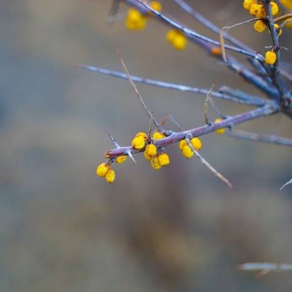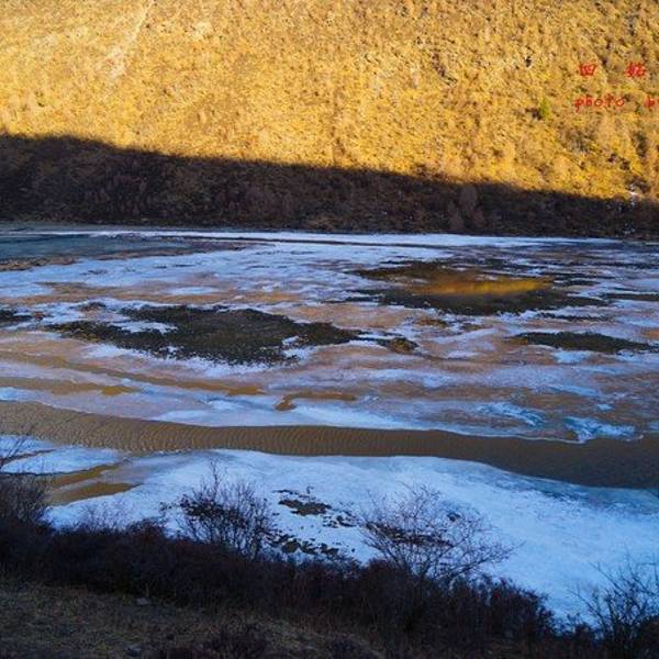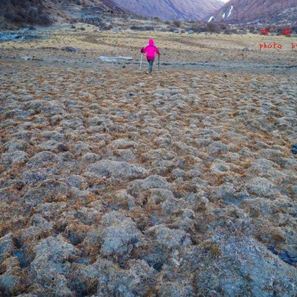 我们心情一下子跌倒了悬崖底,刚才的兴奋感又榨干了我们剩余的一点点体力。琳达彻底已经走不动了。想想也是,营地派出来的协作,我们到现在都还没有遇见过。花海子肯定还在远处,就是不知道多远。这个时候已经5点半了,我们已经走了7个小时了…彦伟看到琳达真的不行了,又帮琳达背了背包。大海子的水面大部分结冰了,只剩下涓涓溪流。就在我们站在原地不知所措的时候,我看到远远的地方来了两个协作。那是营地派来救我们的人,我们都像看到救命稻草一样开心。彦伟帮大家背了很多背包,赶紧来一个照片留念。看到两个协作来了,我也不客气了,把自己的背包给了其他一个协作。自己就背着相机。一路走下来,我带的2.5升水也喝得差不多了,水壶在包上,我也懒得拿了。就这样不带水往前走了。虽然背包可能才十斤不到,但是少了背包,我感觉体力明显好很多,走了一段路都不需要停下来休息。琳达也一直走在我后面。随身带着相机,趁着太阳还没有下山,继续拍照。这里应该算是花海子了,花海子不是因为开花才叫花海子,而是小溪的走向,让整个湖面看起来就花朵一样灿烂。我走得越来越快,逐渐抛离了琳达,又追上了前面的米粒。这个背景不错。路上遇到了这种黄色的水果,米粒大姐和我说,这个就是沙棘,就是我们喝的饮料的原材料。沙棘(拉丁学名:Hippophae rhamnoides Linn.)是一种落叶性灌木,其特性是耐旱、抗风沙,可以在盐碱化土地上生存,因此被广泛用于水土保持。中国西北部大量种植沙棘,用于沙漠绿化。果实中维生素C含量高,素有维生素C之王的美称。地上凹凸不平,踩上去也有点软,不知道这种路面是怎么形成的。米粒走得很快,我只能紧紧跟着。通过这片暂时叫做草地的地方吧,遇到了等待米粒的山脉大哥,山脉大哥以为今天就走12公里左右,一开始还一直和琳达说还有1,2公里就到了,结果1公里走完还有1公里…最后我们走的路线远远不止12公里。