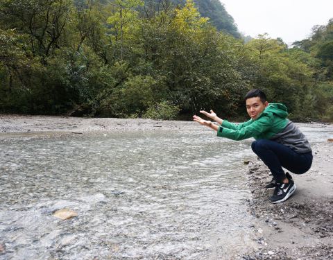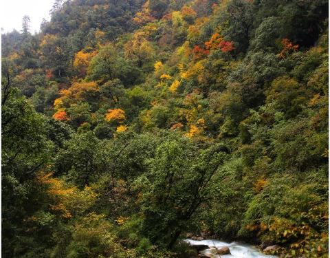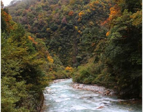 ...羊沟走,有一处平台风景特别美,冰蓝的溪水清澈见底,水流湍急,在一旁的橙黄色的树叶点缀下格外美丽第二天一早起来,天公不作美,下起了毛毛细雨,温度变得更低了,把自己里三层外三层的包裹好,在酒店匆匆吃过早饭后,办理了退房手续。因为徒步爬山大约要1个小时,所以我们选择搭乘景区电瓶车上山。景区观光车票...第二天一早起来,天公不作美,下起了毛毛细雨,温度变得更低了,把自己里三层外三层的包裹好,在酒店匆匆吃过早饭后,办理了退房手续。因为徒步爬山大约要1个小时,所以我们选择搭乘景区电瓶车上山。景区观光车票价分两种:10元,20元,根据距离远近不同,自行选择。这里因为没有太多的陡坡急弯,观光车一路开得还算平稳。在青衣源下车后有两条岔道,左边是东拉山沟、赶羊沟,右边是桂蔷湾、猫子湾。我们往赶羊沟走,有一处平台风景特别美,冰蓝的溪水清澈见底,水流湍急,在一旁的橙黄色的树叶点缀下格外美丽。听说赶羊沟因保护大熊猫,驱逐外国偷猎者而得名“赶洋沟”,辗转改名为如今的赶羊沟。穿梭在林间,可以看见山顶雨雾缭绕,瞬息万变像一幅水墨画一般,宁静致远。一路上河水水势很大,叶子在风中摇曳生姿,色彩斑斓,让人目不暇接。肆无忌惮的徒步行走大约1个小时,这里的景致虽然很美,但是并没有特别之处。来到“游客止步”的告示牌处,好奇的小伙伴观望了一番,还是选择继续前行,走到一处河滩,湛蓝的河水,感觉像是来到了海边,玩性大发的小伙伴还捡起了石头玩起了打水漂。离开河滩喜欢探索的小伙伴还想继续前行,但是前路漫漫,加上时间限制,所以我们又原路返回,走到下车点,来到了桂花泉,深秋时节,桂花已经开过,都是一片绿色的。