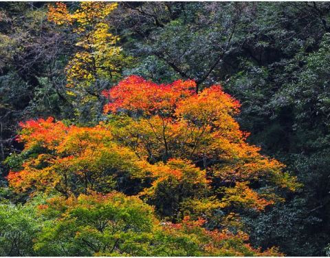 放眼望去,秋林尽染,红叶烂漫,在万亩野生桂花林的绿中尽情绽放。