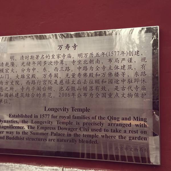 金骆驼 【亮点推荐】明清两代皇家寺庙,慈禧去往颐和园途中休息之处,寺内亭阁台榭、池石假山错落有致,是古...为了把年票的钱赚回来,周末去的,游客非常少,但是会有一些团队来,门票不贵,清静,还不错的小景点。【门票】成人20元,半价10元。【开放时间】9:00至16:30,16:00停止售票。周一闭馆。【优惠政策】持锦绣江...为了把年票的钱赚回来,周末去的,游客非常少,但是会有一些团队来,门票不贵,清静,还不错的小景点。【门票】成人20元,半价10元。【开放时间】9:00至16:30,16:00停止售票。周一闭馆。【优惠政策】持锦绣江山华北版年票免费。北京市最中小学生免费,持北京市老年证、离休证、残疾证、义务兵证免票,在校大学生、研究生半价。星期三免费参观200人次,需要持有效证件。【交通】公交74路; 300内; 323路; 362路; 374路; 482路; 534路; 645路; 944路; 968路; 特10路; 特5路; 特8内; 运通103线; 运通109线; 运通110线; 运通201线,万寿寺站下车即到。【免费讲解】周二至周五,上午9:30,下午2:00有免费的中文讲解,历史古迹听讲解才有味道。【注意事项】寺院清静之地,不可抽烟。吃荤,不要大声喧哗,不要乱摸乱刻。【建议游玩时间】1-3小时,万寿寺面积不大,从前到后1小时肯定能走完,不过寺内的北京艺术博物馆有5万件藏品,细细品味的话时间就长了。【最佳旅游季节】春夏秋冬四季皆宜。【住宿】可以住附近的北京北方朗悦酒店紫竹桥店,距离万寿寺800多米,标准间230元左右,周边环境非常赞。【亮点推荐】明清两代皇家寺庙,慈禧去往颐和园途中休息之处,寺内亭阁台榭、池石假山错落有致,是古代寺庙和园林建筑的典范;寺门口是慈禧水道,沿着河道的堤岸非常适合健身,可以一直走到颐和园。【周边景点】南长河公园、紫竹院公园也都比较小众。 展开
