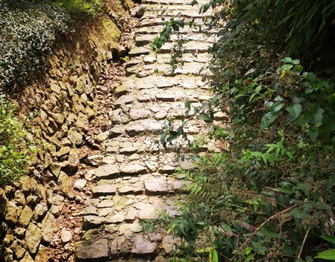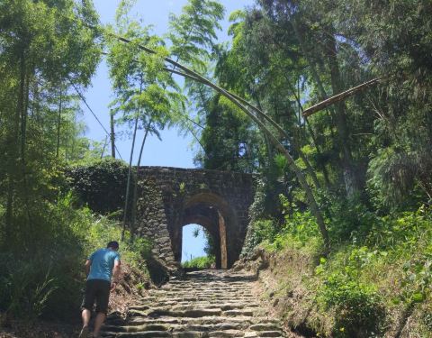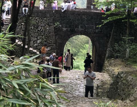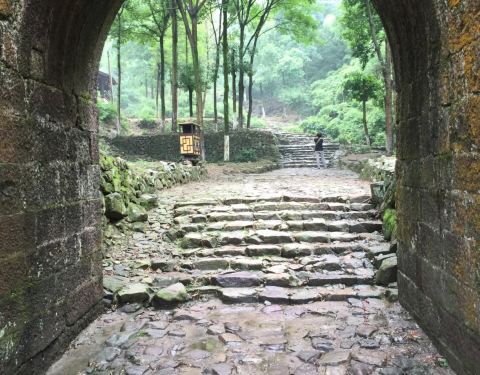 游玩戴笠故居,驱车2公里即来到仙霞关。耳闻此地是驴友找虐的古道,想想自己也算走过走过一些山川,所以信心满满的出发了,古道全是大石块铺就的台阶,历经风雨,已不太平整,也正因为这高高低低更显其古朴。古道两边竹林摇曳,风吹着沙沙响。一旁一条溪水奔腾而过,增添一份灵秀之气。不多久就走到了第一关,也是最大的关,石门城楼,上面还有可攻击的洞口。继续走可以看到黄巢石像和关帝庙,路旁有“双宝树”,令人震撼,真正参天的古树,可惜另一棵只留下半截了。走往第二关的途中体力消耗有点大,时间接近中午,又逢五月高温天,考虑四人中有两位都65+了,于是,到了第二关之后就折返了。古道一路走来,景色宜人,还涨了姿势,值得一游!