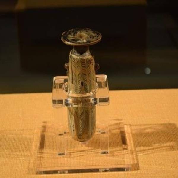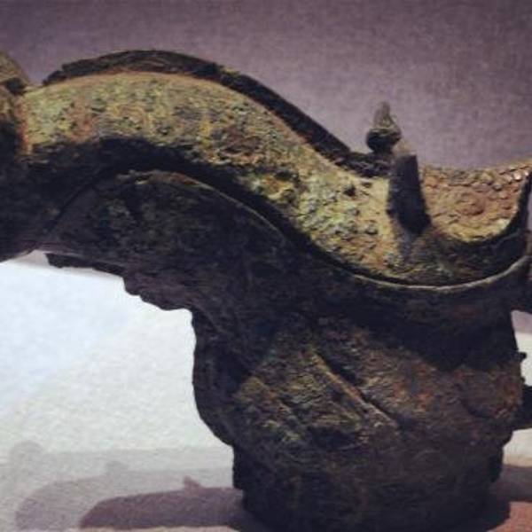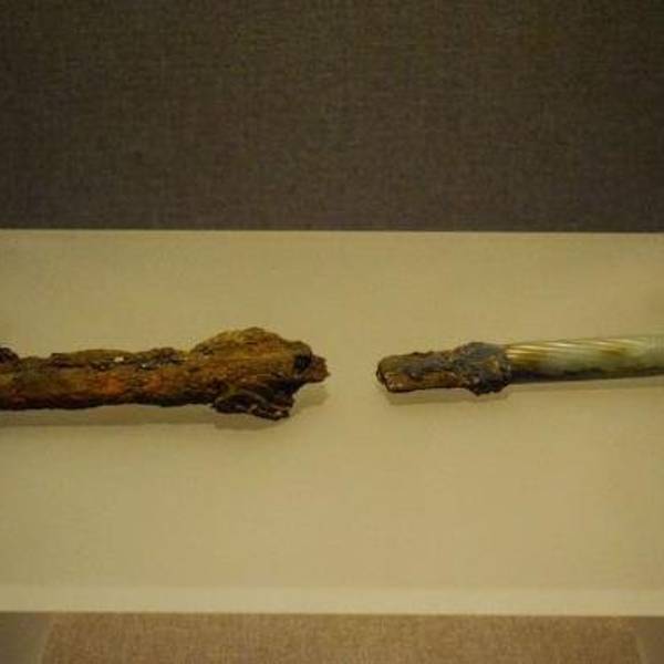 一个人推开两个大象,这个寓意是人类的出现占领了长期被野兽统治的中原大地,推开了文明历史的大门,创造出了灿烂辉煌的古代文化。河南简称豫,豫字在甲骨文中,便是人牵着大象,这从另一反面说明原始时期中原还有大象出没。(2)玉柄铁剑