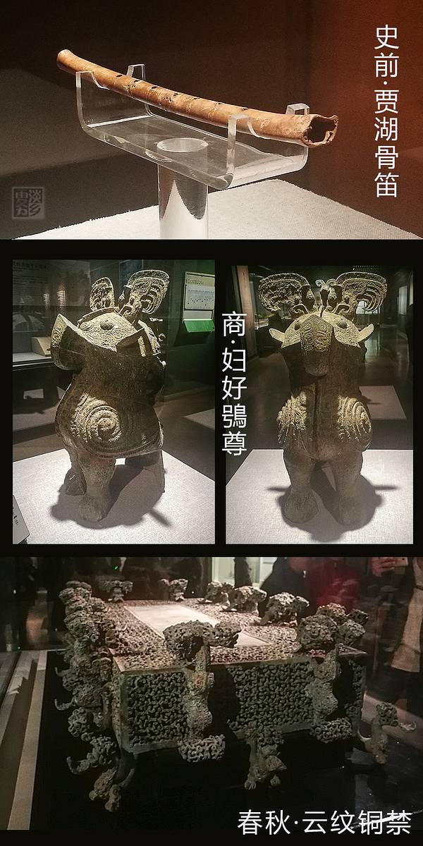 我去的那天正在展出的是大象中华——古代文明瑰宝展,非洲面具展,和抗战时期版画展。其中大象中华的展品质量最高,在这里可以看到从远古时期开始的灿烂的上下五千年中华文明,因为毕竟中原地区是中华民族文明的发源地,所以这里占了很多个第一和最早。比如中国最早的七音骨笛——它使用了丹顶鹤(还是其他动物)的骨头制作的笛子,至今还能吹奏出美妙的乐曲,这也对中国的古乐器史研究也有很大帮助。还有很多精巧别致的饰物、祭祀器具、房屋模型等等。旁边时常会看到有人在进行讲解,很详细很生动。