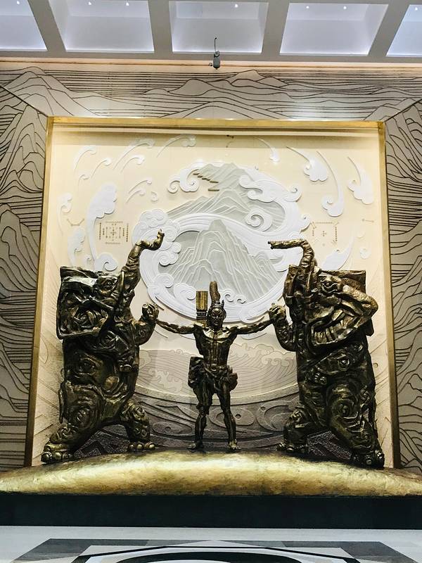 在建筑的最上面,分别刻画了朱雀、玄武、青龙、白虎四象,镇守四方。除主体建筑外,共计8个配楼,寓意“九鼎定中原”。