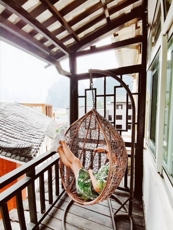 我为了在阳台秋千上拍照选了121,远处就是20元人民币的大慨背景图,望出去就是漓江风景,但前排房子有点挡住视线,所以没必要多花20元住阳台的,因为天台上也有秋千和长排的沙发椅。
