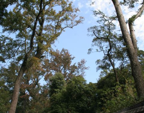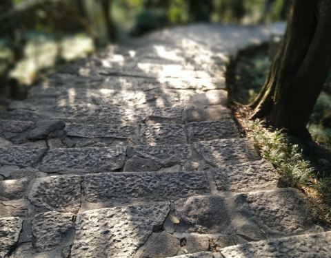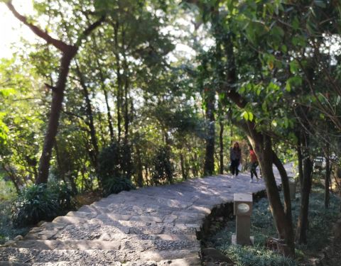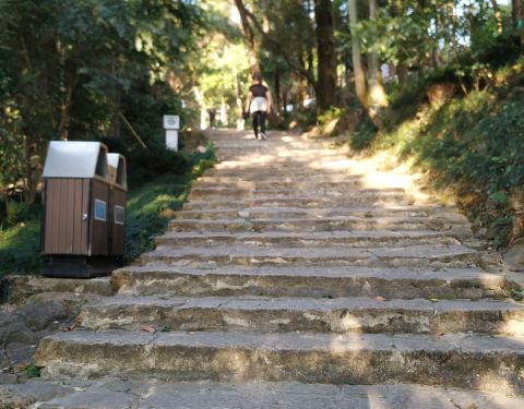 游人步行在林荫深处,能感受到树林的静谧和大自然的神秘台阶小道 走进鼓山,与环山马路并列,有一条曲折蜿蜒的台阶小道在树林里逶迤而行,一直通往山顶。游人步行在林荫深处,能感受到树林的静谧和大自然的神秘。
