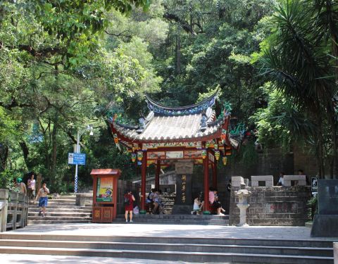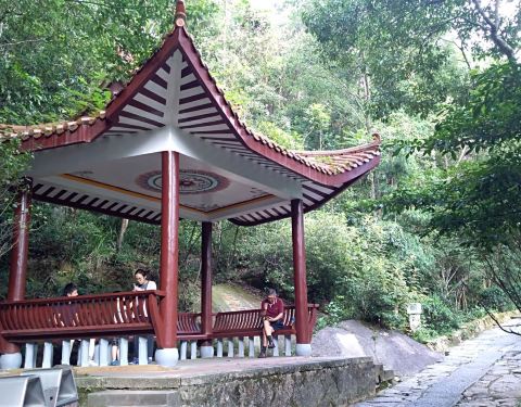 这是古时登鼓山之道。从山麓廨院登上2000多级台阶,经过“七亭七里路”就可到达涌泉寺山门。 第一亭:“东际亭”。过廨院即是东际桥,桥上过亭就开始登山。上99级石阶至“仰止亭”(已废)。 第二亭:“石门亭”,古名“听涛观瀑亭”。距第一亭367级台阶。溪水淙淙不绝于耳。 第三亭:“乘云亭”,与前亭之间有271级,沿道有石刻“乘云”、“仰涛”、“小鼓”、“天风吹梦”、“风怒涛飞”等。 第四亭:“半山亭”,由第三亭至此,共有494级台阶。亭在半岭,故名。过此亭百余阶,有石刻“路通仙苑”,转小径可达十八洞景。“半山亭”后近300阶有石刻“桃岩洞口”,往东可到桃岩洞,桃花精舍。 第五亭:“茶亭”,过半山亭约520台阶即可达此。因亭附近有茶园而得名。道边有石刻“欲罢不能”、“宜勉力”等。据说清乾隆时福州知府李拨登山至此,气喘吁吁。往上走,力有不逮;往回走,心不甘愿。遂题“欲罢不能”于亭旁大石上。 第六亭:“松关亭”,距“荷亭”有300多级台阶,附近有石刻一笔“寿”、一笔“龙”、一笔“虎”,还有文天祥所书的“忠、孝、廉、节”等。 第七亭:“更衣亭”,过“松关亭”几十步即是。传说闽王当年上山入寺,便在此更衣。有联曰:开门曾仰前王节,入寺还更此地衣。登山至此,汗流浃背,而高处生寒,正需更衣、添衣。附近石刻有“毋息半途”、“眼底浮云”、“心路须平”等。