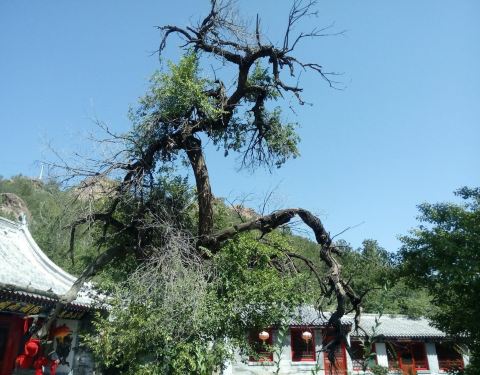 一个可以登高望远的好地方,长廊蜿蜒逶迤在山峦上,我们在长廊的亭子里休憩,凉风习习,煞是爽快,在这里可以俯瞰张家口市,山不高,大人小孩老人都能登上山的。山下有水母宫的庙宇,枯树,预示风调雨顺。也有香...