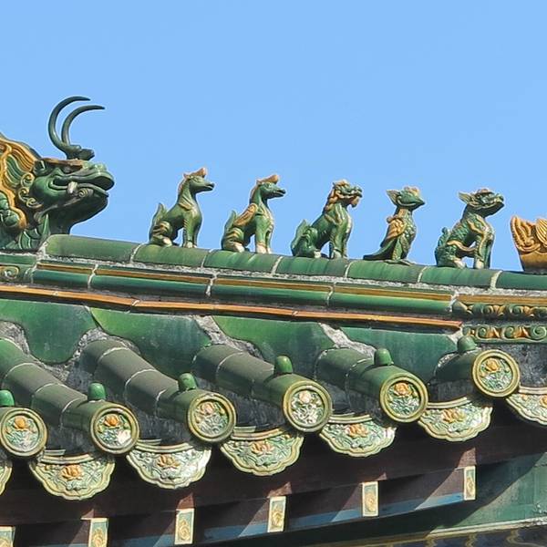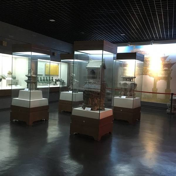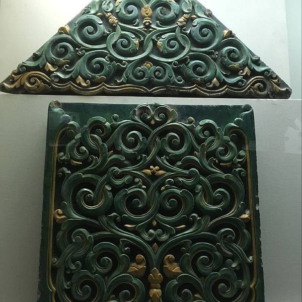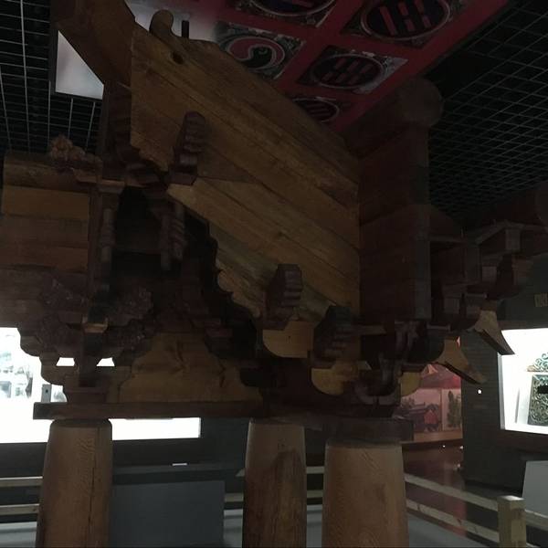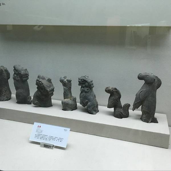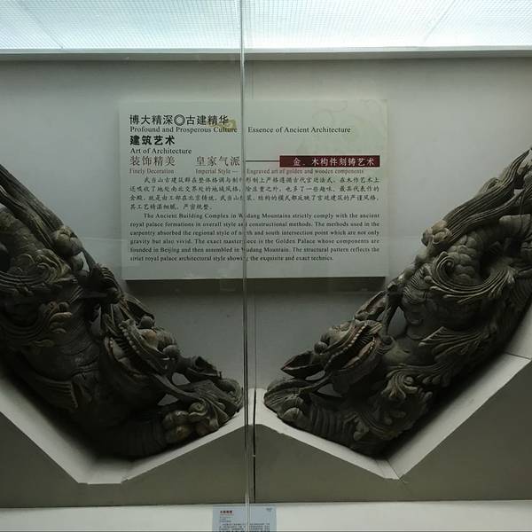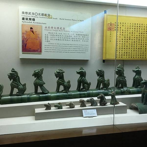 武当博物馆的整个场馆是一个椭圆形的两层楼建筑,外表看起来是非常简洁而大气的,博物馆的中间一个太极广场,对面正对着的是太极剧场。我们是2点40到达的,结果门是关着的,我们以为是闭关,就在附近的商店买水顺便打听了一下,店老板告诉我们应该会开门的,于是我们在前面等了一会儿,大约快3点的时候开馆了。所以除了星期一以外,如果去了看到关门了,就跟博物馆前后门的保安打听一下当天是否会开门!除了需要携带身份证意外,饮用水都是不可以携带进去的,需要寄存在门口的哦,这个跟很多博物馆一样。就没什么好纠结了的!拿身份证在大门入口右手兑换了门票之后,安检之后就可以开始参观了,如果跟我们一样需要保留门票的话,就提前跟工作人员说,不然门票在检票之后是不退回的哦。一楼的两个展厅主要是讲武当山的建筑,照片和展馆都非常详尽的在展示武当山建筑的美。特别是木雕的部分是最让我觉得叹为观止的,非常的精细和完整,建成这么多年,居然还能保存的完好如初,精细无比,各种神兽的细节雕琢的最让人叹服,胡须鳞片都是栩栩如生。即便是现在有这么卓越的电脑技术之后,也不一定能做到这么传神,防腐技术这么完美吧!这些可是武当山建筑上面的屋脊上的一些神兽,有没有觉得憨态可掬呢!真的很难想象这是六百年前的古人们烧制出来的琉璃制品!太精美了!