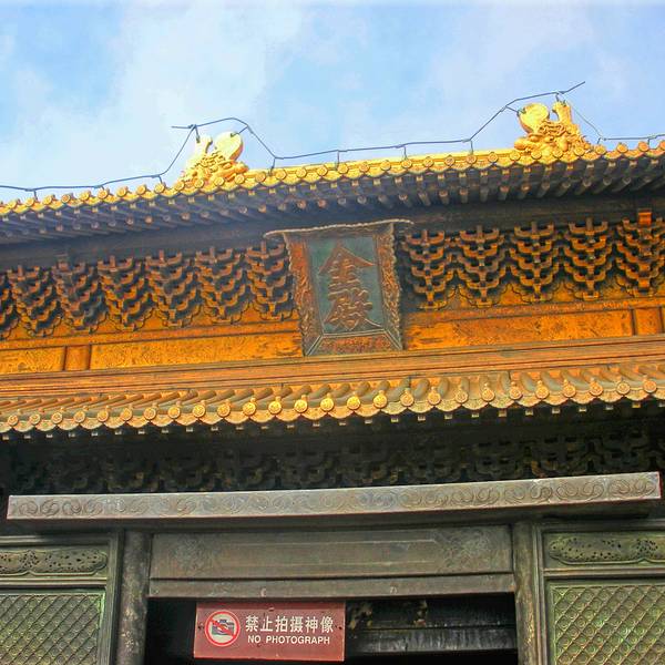沿台阶从右侧向上,先见到一个里面暗暗的殿,只有通道,原来这就是转运殿。继续向上见到稍远一点的铜殿,独立在树木掩映之中。很快到了金殿前,由于时间较晚,缆车已停运,金顶上一改以往人满为患的情况,我可以随意欣赏拍照,非常心安的状态。