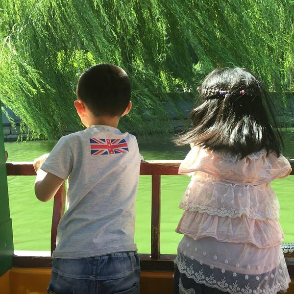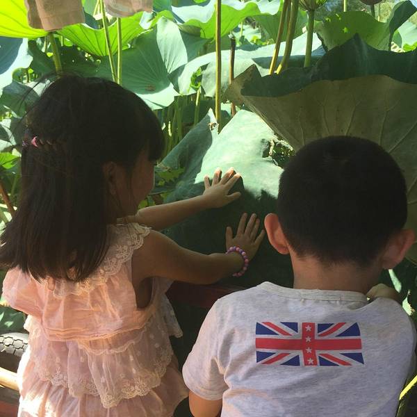在北京一直都是阴天或下雨,但是到了4号这天天气放晴,北海公园蓝天白云,蓝色的湖水倒映着美丽的白塔。我们还是选择了画舫游船,一片莲叶荷花,非常好看,孩子们也是被美丽的景色吸引。
