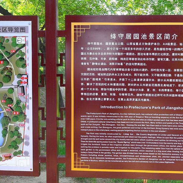 一早起来,去绛守居园池,这园又称隋代花园,网上一查,还真有名气。花园面积14640平方米,是我国现存唯一的隋代州府园林。园池始建于隋开皇十六年(596年),当时的内军将军临汾县令梁轨,见百姓饮水困难,从城北30里处的鼓堆泉导水开渠灌田,引余波贯牙城,蓄为池沼。因在绛州府衙的后面,是府衙的后花园,谓“绛守居园池”