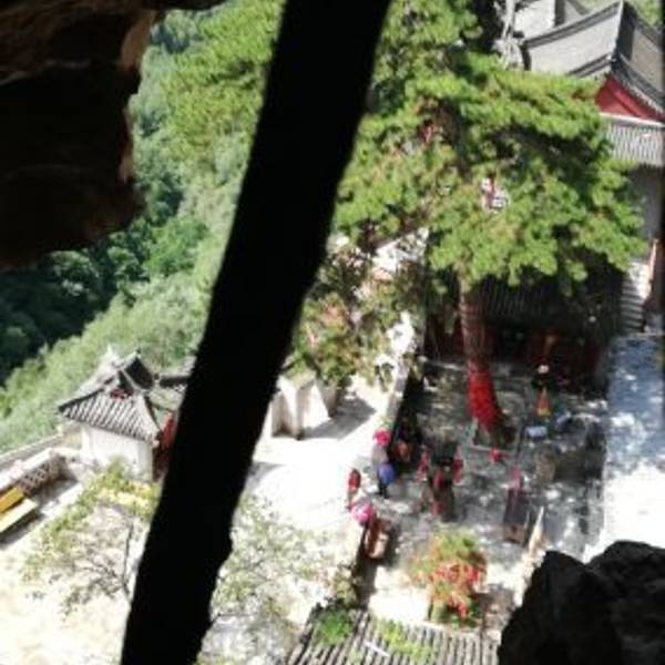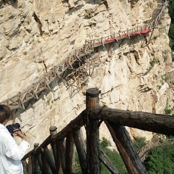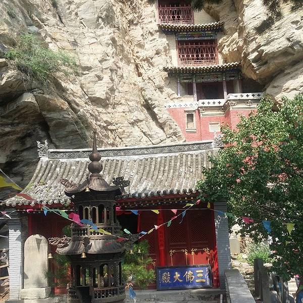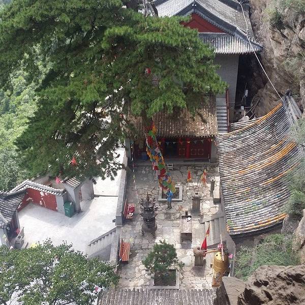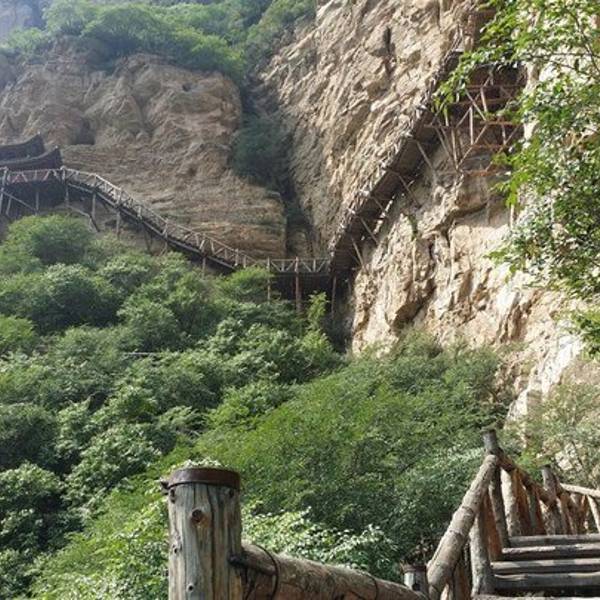如果没有去过恒山的悬空寺,来这里感受一下崖壁建筑也是还不错的。赵杲观,当地人仍喜欢叫做“天台寺”,位于天台山峡谷内,因为开发的时间比较晚,交通还不是很方便,没有公交车直达,所以我们当时只能选择从代县城内包车前往赵杲观,私人面包车往返约需80元-100元(这是当时的价格,不知道现在涨价没有),大致一小时就可以到达。在门口购买了20元的门票(没有优惠票),就可以进入景区了。景区大门距离道观其实还有一段距离,而且上山的路并不好走,多弯道,建议上去之前,问一下工作人员路线,否则很容易走冤枉路。里面大部分的建筑都是沿山而建,其中多处庙宇建在光滑的石壁上(因此远看的时候,好像空中楼阁)。主体建筑多在北部,最富盛名的就是“仙阁登云”,参观时必须沿铁索攀援而上,一路都十分惊险。