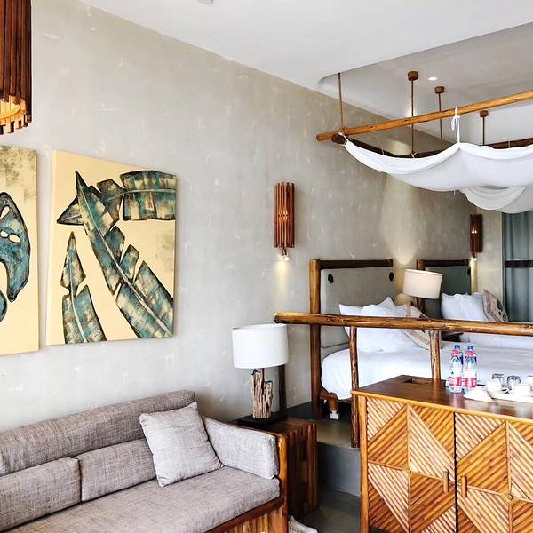 ▫️亲海房的重点介绍:配有超大阳台的小复式房型,入住必PICK!干湿分离的超大浴室,复古设计,洗手盆洗浴间等皆用石头砌成,有专门的换衣间,床铺均是1.8m的大床,古色古香,床上的帘幔、客厅壁画、木质的家具,夕阳西下,在阳台躺椅上吹着海风听着音乐,深感自己在遥远而美丽的土耳其!