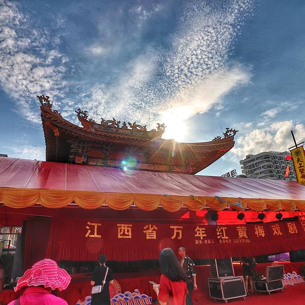 一群衣着光鲜的演员唱唱跳跳为妈祖庆生,律动的锣鼓声、整齐有序的舞蹈。视听功能一时出卖了我,似乎把我狠狠的拉入其中,融入了这个大家欢喜的环境中去,时不时身体随之摆动。有很多节目拉,黄梅戏、相声等等。一群小伙子在红色的舞台上跑来跑去,扩成一个大圈,又缩成一团。各种才艺展示,实在看点十足!