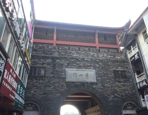 秀山门是古池州城的一座古城门,是宋朝为纪念梁昭明太子萧统而改名。秀山门现在除了城门之外,门后建好了一条步行街,旁边还修建了博物馆,是池州著名的景点之一。