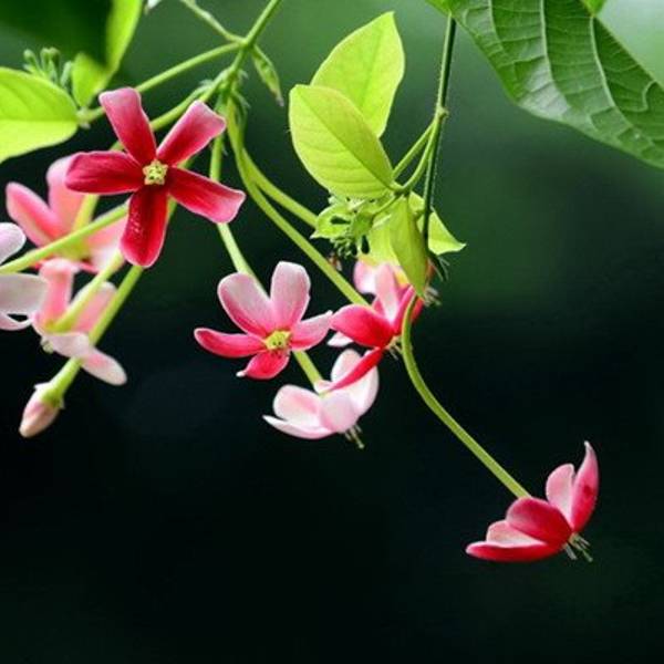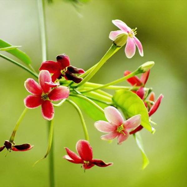 嘉兰——“红黄绿三色合一,我就是色彩女王!”嘉兰的花瓣向后反卷生长,同时其花瓣边缘呈现出波浪状,尽显优美姿态,所以花名出自拉丁文的“惊叹”、“美丽”之意。嘉兰的花语如它雍容华贵的外形一样,象征着荣光。在我国,它主要分布于云南西双版纳等地区,位于西双版纳州的勐远仙境同样也是嘉兰生长的乐园呢!使君子——“嘉兰和我比花色,还差那么一丢丢。”在《本草纲目》和《中国植物志》等各种书籍的记载中,我们可得知使君子拥有悠久的历史和极高的药用价值。然而,明明可以靠“才华”吃饭的使君子偏偏还有“颜值”。使君子的开花初为白色,而后渐变为粉色,再变为艳丽的红色。通常也会出现红、粉和白几种颜色的花朵并存的景象。