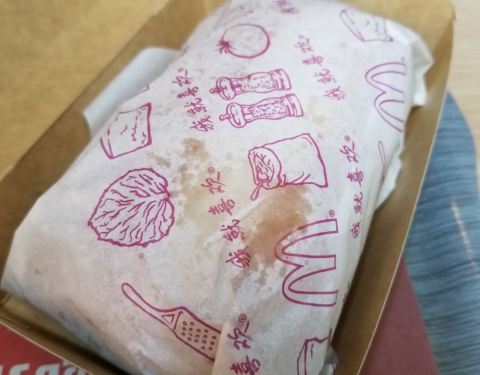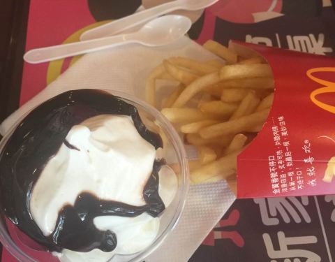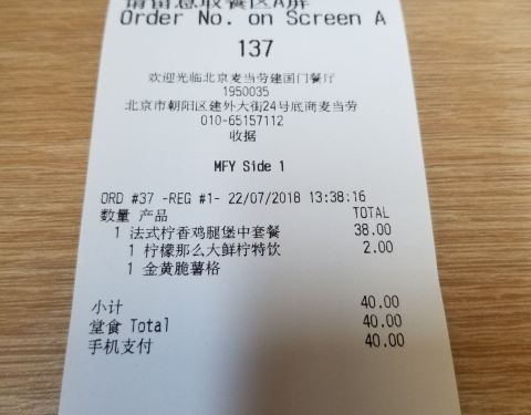 这家麦当劳餐厅在建外大街(马路南),一共有两层。点了一份法式柠香鸡腿堡套餐,汉堡口感不错。因为脆薯格不是刚刚出锅的,所以有点儿硬。那么大柠檬超级大一杯,很适合现在的北京。