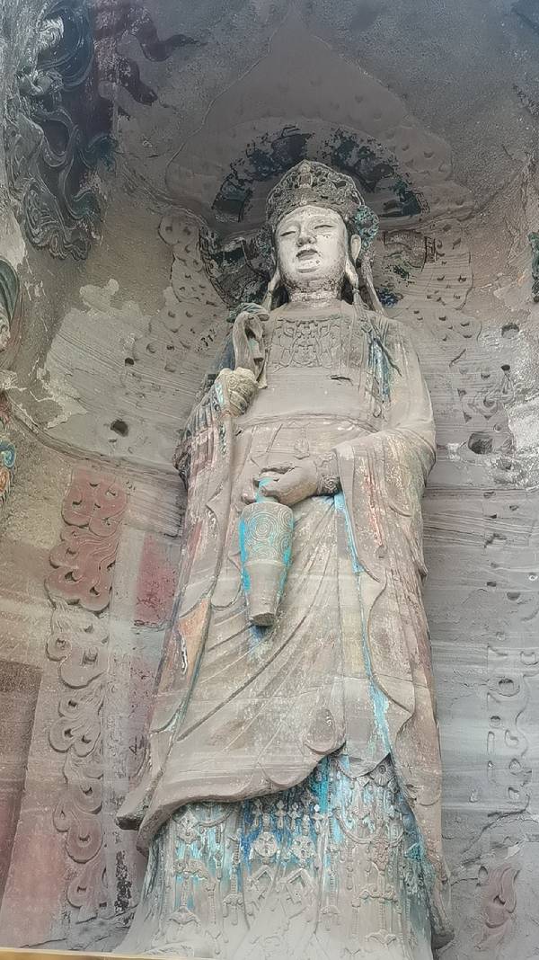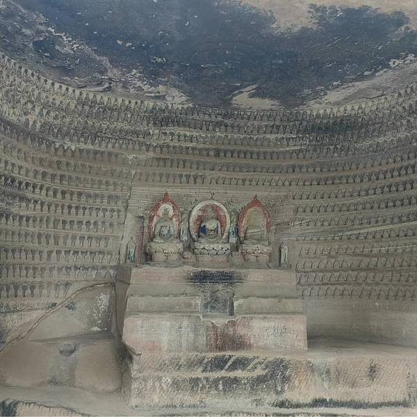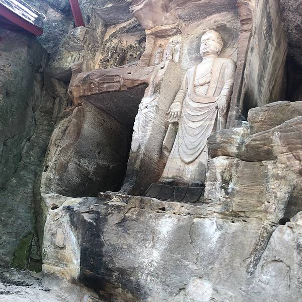 距今已有1300年历史。佛像面南背北,头东脚西与佛经内容相反,专家分析有可能是将就岩体石质的原因。佛造像全长31米,两手均长伸,头枕莲花形圆枕,眼睛半闭,嘴角含笑,雍容安祥。在其腰部有一弟子背向半结伽趺...距今已有1300年历史。佛像面南背北,头东脚西与佛经内容相反,专家分析有可能是将就岩体石质的原因。佛造像全长31米,两手均长伸,头枕莲花形圆枕,眼睛半闭,嘴角含笑,雍容安祥。在其腰部有一弟子背向半结伽趺坐,正在为其把脉,虽面部已损毁不知为哪位弟子,但左胁卧与弟子诊脉均为独一无二的不落于窠臼的艺术