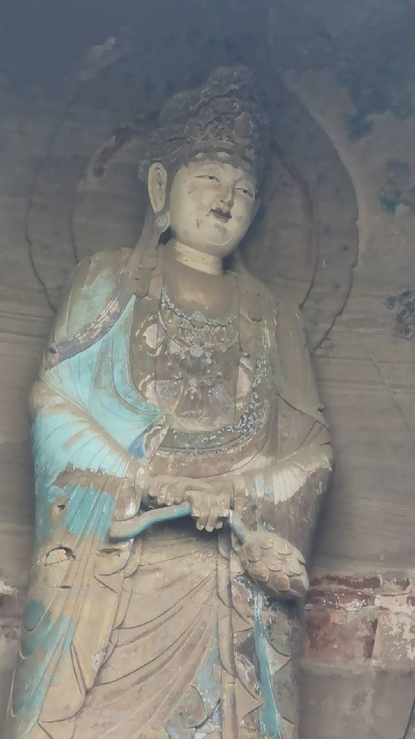 距今已有1300年历史。佛像面南背北,头东脚西与佛经内容相反,专家分析有可能是将就岩体石质的原因。佛造像全长31米,两手均长伸,头枕莲花形圆枕,眼睛半闭,嘴角含笑,雍容安祥。在其腰部有一弟子背向半结伽趺坐,正在为其把脉,虽面部已损毁不知为哪位弟子,但左胁卧与弟子诊脉均为独一无二的不落于窠臼的艺术