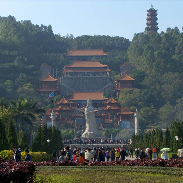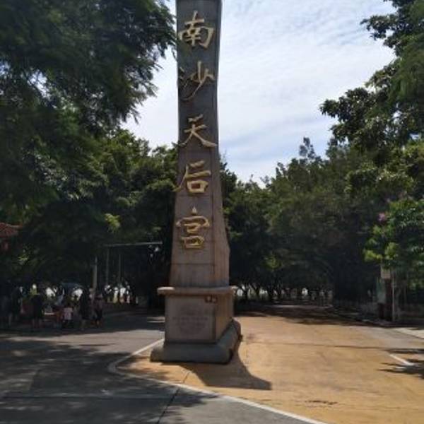 南沙天后宫,又叫做妈祖庙,祭拜的是天后林默,她是百姓崇祀的海神,这里的香火特别的旺盛,出海的渔民、客船都会来拜拜。作为东南亚地区较大的妈祖庙,它集北京故宫的风格与南京中山陵的楼阁气势于一体,很值得一游。 南沙天后宫,南望虎门与伶仃洋,它主要由天后宫广场和宫殿建筑群两个部份组成。 天后宫广场中间高耸着高达14.5米的天后石雕像,据说由365块细心雕琢的花岗石构成,象征天后一年365天的庇佑,也是游人合影留念的好去处。宫殿建筑群在天后宫广场的后方,整个是清朝时期的建筑风格,并且依山而建。 先可以看到正门牌坊,穿过牌坊到达山门,即是南沙天后宫的正门,室内供奉的是“千里眼”和“顺风耳”两尊神像。继续拾级而上,山门的两侧有钟楼和鼓楼,钟鼓楼内的钟鼓都会按时敲击。在山门的上方为献殿,殿内供奉“蹈海天后”,四海龙王在两旁站立。再上方的正殿是整个天后宫的中心,有木雕神龛,供奉3.8米高、香梓木雕、贴金的天后像。寝殿则在正殿之内,在这个寝殿中特别安置了一台织布机,因为传说中天后娘娘曾在15岁时,于一次织布途中从海上救父脱险。另外,寝殿中还摆放床、梳妆台及镜子。 整个建筑群高点是位于后方的南岭塔。塔高45米,楼阁式建筑,在南岭塔可远眺整个南沙天后宫,只是目前无法登塔,有点遗憾。