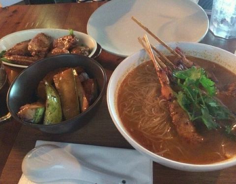 冬阴功河粉很好吃,粉虽然细但是不断,汤底也不错,烤牛肉就一塌糊涂了,肉老还柴,吃一半丢一半,甜...