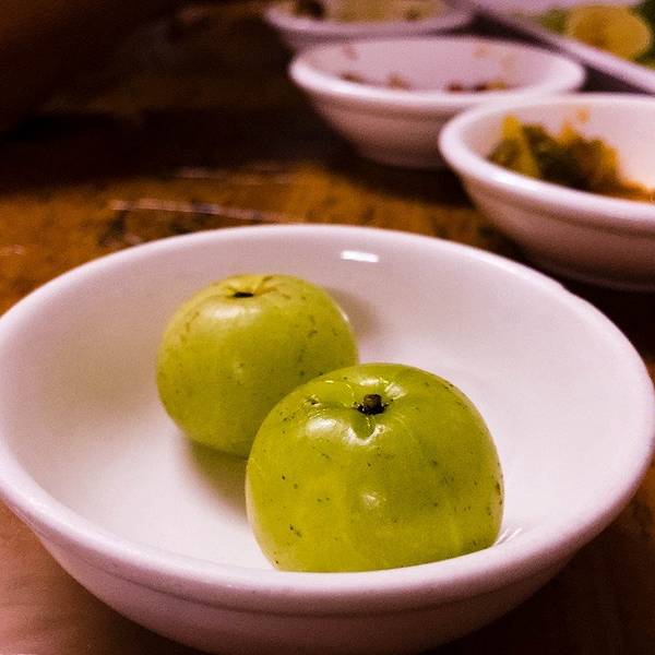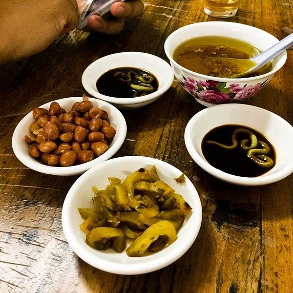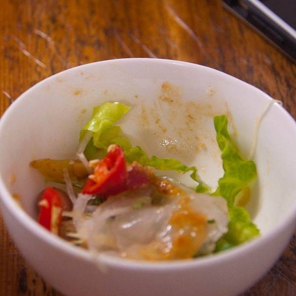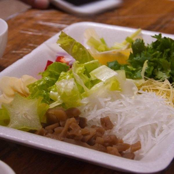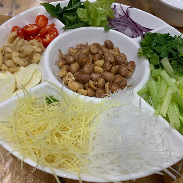 大排档的环境,居然是吃生鱼片,潮汕的生鱼片跟我们日本料理店吃的作法完全不一样,它用的是淡水鱼,并辅予一大堆的配料,热情的老板娘的教法,吃鱼生和虾生,都要用碗,把它们给配的配菜(包括生洋葱、生蒜、辣椒、生菜、萝卜、黄瓜、姜丝、咸菜、杨桃、香菜、芹菜、九层塔)各挑一点,放在碗里,加上他们配的调料香油,再加上一块粘上芥末酱油的鱼生,然后张开大嘴,把这些东西一口吃下去……这种吃法就是鱼生在口腔中食物的占比会比较小, 当然如果鱼生和虾生按传统吃日本料理吃法,只粘芥末的话,淡水鱼因为含油量比较少,口感会偏干,没那么润,就没那么美味。说实话,鱼生不如三文鱼的绵软,不如北极背和鲜甜,也没有鲷鱼的Q弹,但在各种配料加在一起,就如同一曲交响乐在嘴巴里面奏响,你说不上什么特别明确的口味,可就却又是那么独特。