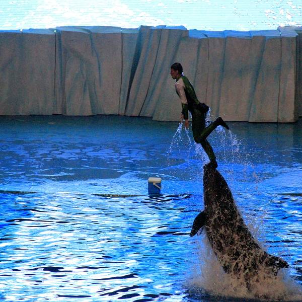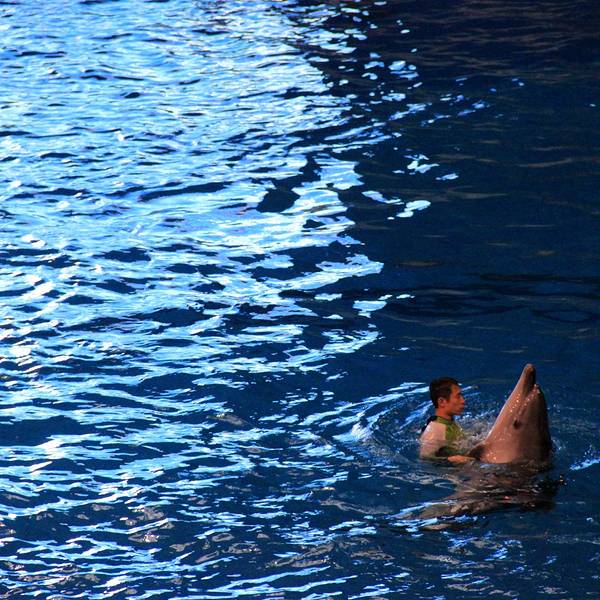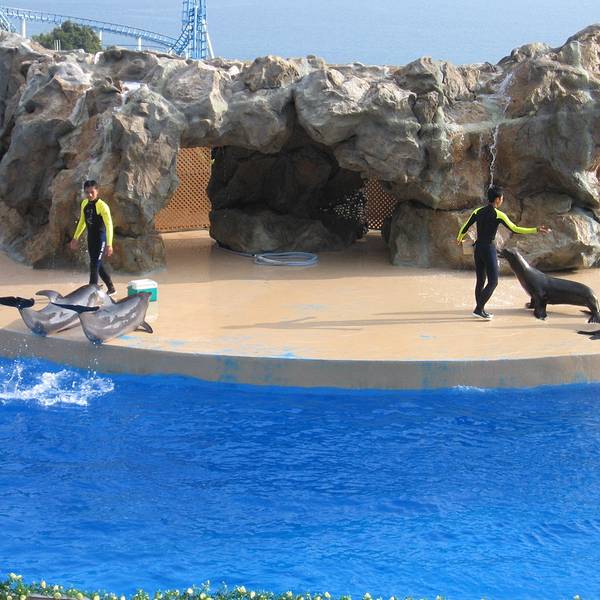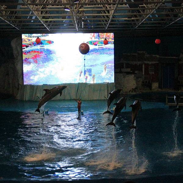 海豚表演馆于1995年5月建成,馆内还建有可容纳800名观众的室内表演场,顶棚密布"满天星"灯,四周设置立体声音响,并有随时可调节水温的先进的控温系统,使观众一年四季皆可观赏海豚表演.在1996年国务院组织的评选中,被评为中华之最。被授予中国(大陆)第一座海豚馆称号。