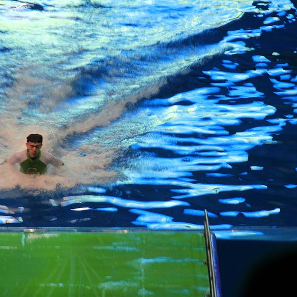 海豚表演馆又称海洋剧场,占地4万平方米,建筑面积7200平方米,是一座白蓝相间的船型建筑。