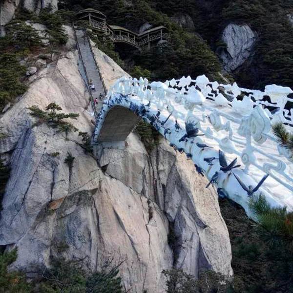山顶能清楚地看到下面景区导览图显示的,真正的“鹊桥”,观光电梯,“小 华山 ”等景点,还等着我们一个一个去探访呢。