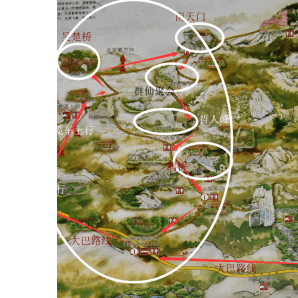 我看了看示意图后,决定先上南 天门 ,从那一侧迂回到最著名的“哲人峰”。