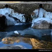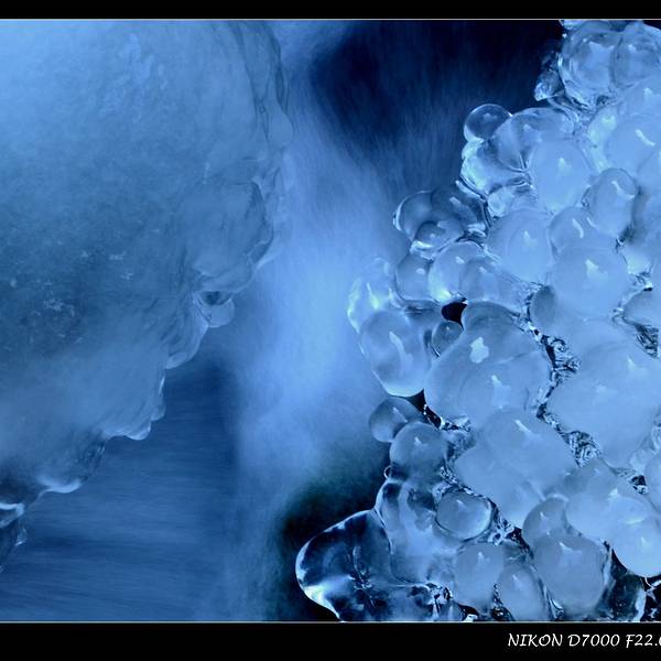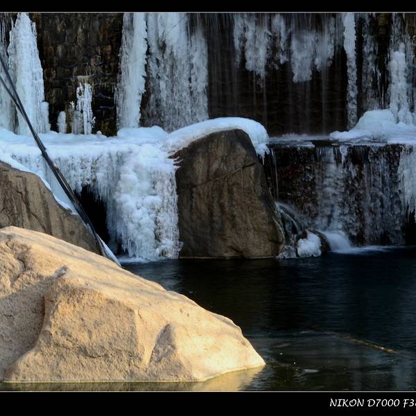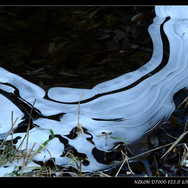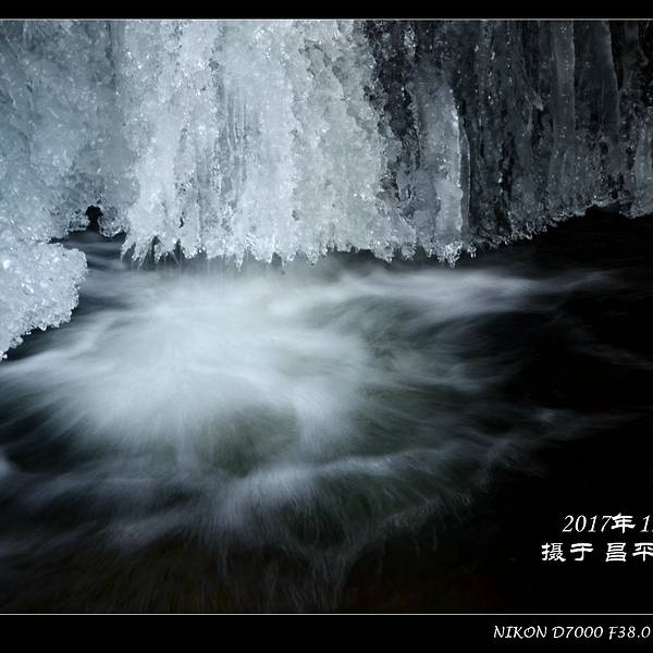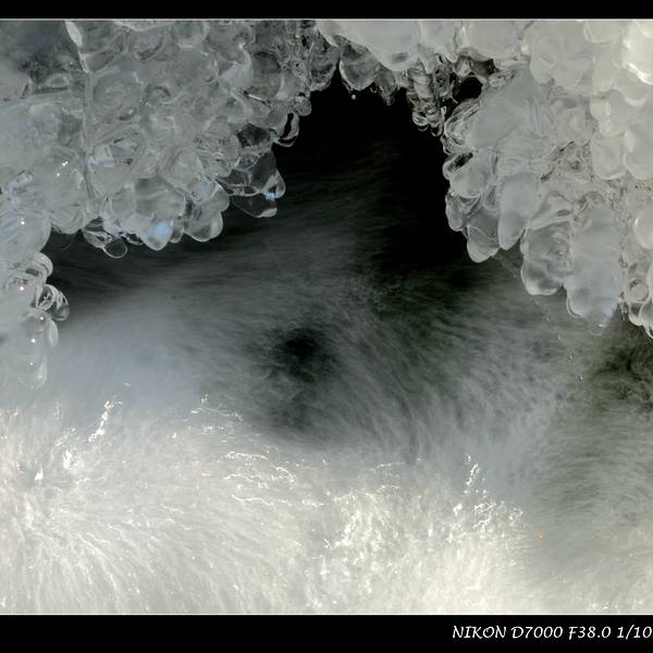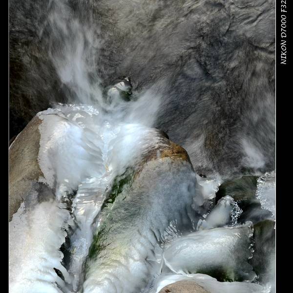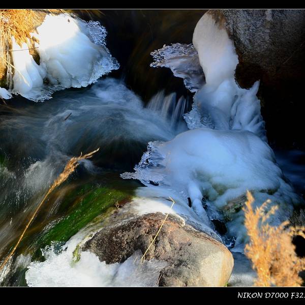 顺着溪谷一路前行,随处可见潺潺溪水在冬季里结成的冰花。我个人非常喜欢这种摄影作品,于是自己也蹲下身,屏住呼吸,因为没带三脚架,努力端稳相机用慢门来拍摄几张。