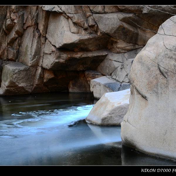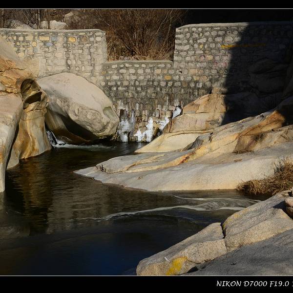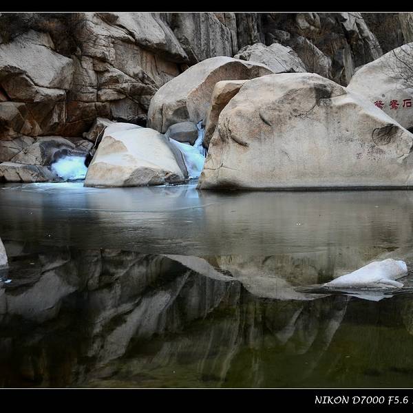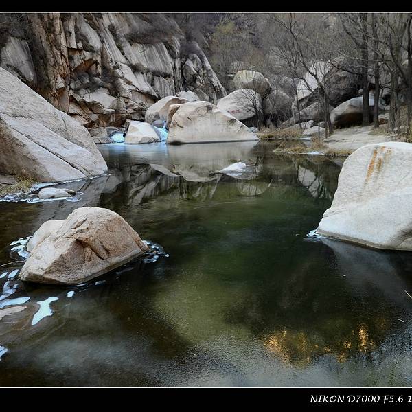 碓臼峪景区里的潭水很多,名字也多和其他景区里的潭水名字相仿,实在记不住。潭水大多结了层薄冰,进入潭的流水从岩石间不息地潺潺注入,四周大多也变成了冰凌;阳光下没有结冰的潭水很清澈,清澈得令人惊奇...