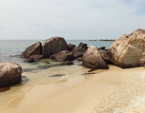 这里是拍摄琼州海峡日出日落的最佳地点,可惜起雾了,亚洲第一灯塔木兰灯塔若隐若现,风车也没看见海南岛最北端木兰湾,位于铺前镇,只有自驾游才能过去,因旅游商机不大略显荒凉,游人留下的垃圾袋、矿泉水瓶子时时都在。但这里水清浪急,怪石嶙峋,时有螃蟹在岩石中爬行,怪石是这边海岸线的特色风景,因绿色...海南岛最北端木兰湾,位于铺前镇,只有自驾游才能过去,因旅游商机不大略显荒凉,游人留下的垃圾袋、矿泉水瓶子时时都在。但这里水清浪急,怪石嶙峋,时有螃蟹在岩石中爬行,怪石是这边海岸线的特色风景,因绿色的海草和咖啡色的礁石,有人形象的比喻这些石头像抹茶巧克力。据说就是因为这些怪石,当时出海渔船常在这里触礁搁浅沉没,渔船船板散落堆积在此,称为“木烂湾”,久而久之称为木兰湾。这里是拍摄琼州海峡日出日落的最佳地点,可惜起雾了,亚洲第一灯塔木兰灯塔若隐若现,风车也没看见。 展开
