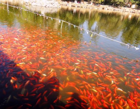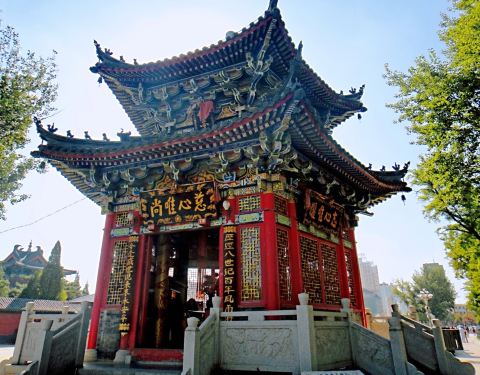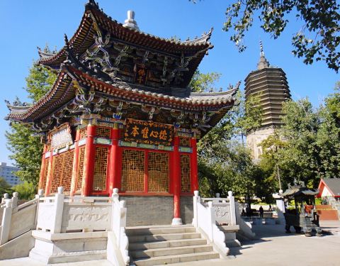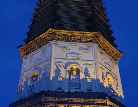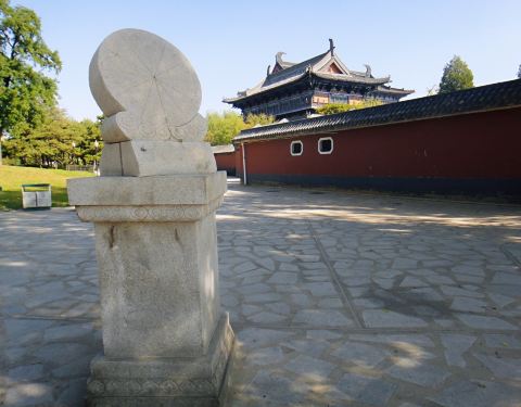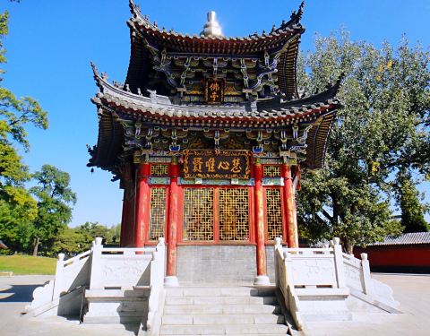 辽阳的top1景点一定是白塔公园,白塔公园内含众多辽阳知名景点。公园门前是石雕版的寿屏,在之后的王尔烈纪念馆及辽阳博物馆内都会有关于寿屏的介绍。 进入白塔公园不久,就可以看见圆通禅院。整个寺院的外观看起来并不大,但是异常幽静,在进入寺院之前,可以看见一个广场,广场中心的地面上写着福字,由于年头久远,福字已经有些不太清楚了。 圆通禅院内,我仰视着金碧辉煌的众多佛像,阳光倾泄下来,真的有佛光普照的神圣感,那一刻时间都停滞了。 白塔公园分为辽阳白塔和广佑寺两部分,在参观辽阳白塔之后,是塔泉和放生池。白塔公园内的放生池面积很大,其实是一座湖,远远就看见放生池上一大片渐变红色,从桔红到深红,走近才发现都是锦鲤。波光粼粼的湖面上,如此大面积的锦鲤,我还是第一次见到,好壮观鸭!这差不多是我见过面积最大的放生池鱼群,鱼儿们欢快地在池水中嬉戏,甚是好看。 之后到达药师佛亭,也叫慈心佛五方亭,亭碑上写着其曲折的历史,原来药师佛亭是广佑寺的。 药师佛亭四面的牌匾各不相同,重檐木质的五方亭异常精美,里面供奉着药师佛像。