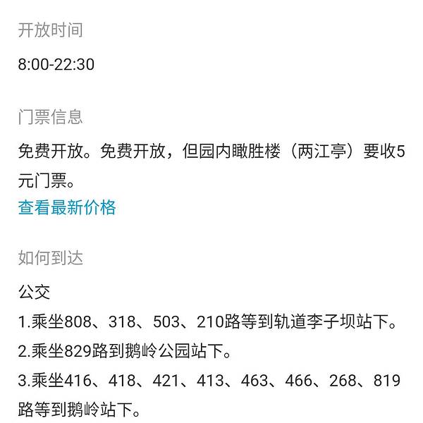 鹅岭公园的视野极其绝佳 人少景美是一个可以欣赏重庆渝中,嘉陵江全景之地。藏有日式园林广岛园重庆渝中区这个公园111岁了,一步一景像走进日式园林,它就是咱大重庆“最老资格”的“人民公园”—鹅岭公园。 始建于清宣统元年(1909年),老渝中区人小时候都和这块石头合照过。鹅岭公园的视野极其绝佳 人少...重庆渝中区这个公园111岁了,一步一景像走进日式园林,它就是咱大重庆“最老资格”的“人民公园”—鹅岭公园。 始建于清宣统元年(1909年),老渝中区人小时候都和这块石头合照过。鹅岭公园的视野极其绝佳 人少景美是一个可以欣赏重庆渝中,嘉陵江全景之地。 鹅岭公园是重庆最早的私家园林,里面很多古迹,澳大利亚公使馆旧址,是澳大利亚第一个驻华公使馆所在地;由桥梁建筑师李和阳设计的石绳桥;七层塔的两江亭;藏有日式园林广岛园;还有和平钟,苏军烈士墓。 随手一拍妥妥日式民国混搭风。 门票:免费;时间:8:00-22:30;交通:轨道1号线鹅岭站。 展开 2024-02-15 07:23