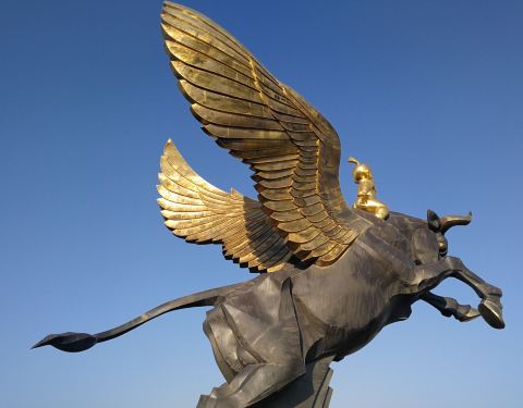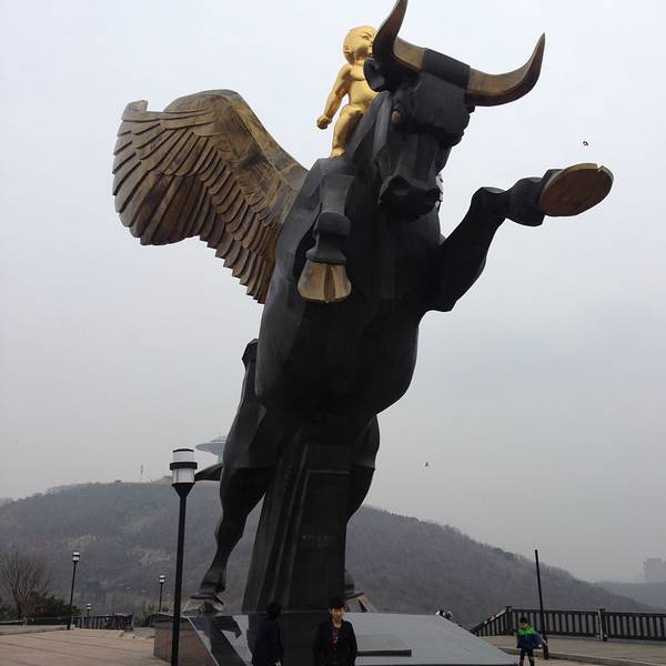 风景很不错的一个地方,适合开车自驾短途游,从大连开过来大概一个小时左右,时间赶得及的话还可以去一下更远点的金石滩。上午十点多到达,把车停在山脚下,徒步上山,上山的步道和大连的滨海路一样,是木栈道,两边是青山,空气很清新,让人感到十足的放松和舒适。一路沿着木栈道走上来,就能走到爱情公园,园内有很多关于爱情的石碑,适合情侣和家庭拍照留念,逛完小公园,大概也就二十分钟的时间,可以走木质台阶登上飞碟前面的小广场,山顶风比较大,登高望远,一面是金州开发区的全貌,一面可以看到远处的童牛和海景,视野很开阔。如果时间比较紧,可以开车一直到山顶的停车场,然后再走台阶到飞碟那里,也是不错的体验。原路返回到山顶停车场,然后可以选择开车或者步行去看童牛,走上棕色的木质台阶,巨大的童牛雕像就在眼前,非常的宏伟,台阶总给人一种安静怀旧的感觉,特别喜欢这种建筑风格。在童牛脚下有一个绝佳的拍照点,离童牛大概十几级台阶的那个小平台,人站在那里可以照出童牛的全貌,另外一侧则是休息的木板凳,还可以看看远处的大海。 童牛岭最佳之处在于,一基本不收门票,除非要登上飞碟,感觉一般人也不会有这个兴趣。。。二是平日人不多,不会出现排队拍照的情况,三在于公园够大,随便走走再带上野餐基本就是一天的时间。 童牛岭的地理位置极佳,一面靠山,一面环海,传说中是童牛飞天之处,也有非常好的寓意,比很多收费景点都更值得一去,如果是外地来此旅游,可在去金石滩的路上去随便看看,至少是一个难得的山上观海之处。
